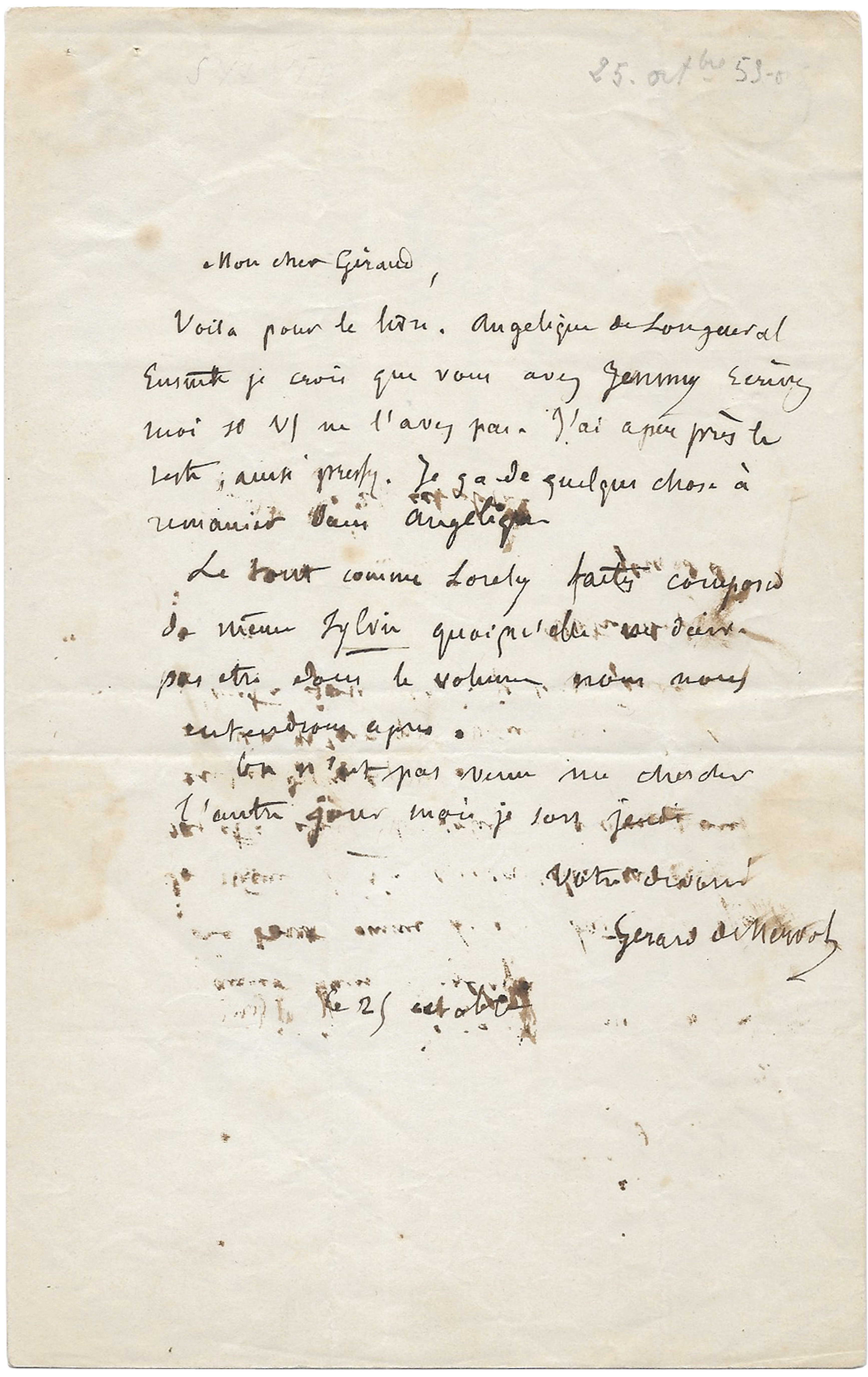 Voilà pour le livre [Les Filles du Feu] – Angélique de Longueval. Ensuite je crois que vous avez Jemmy. Écrivez-moi si v[ou]s ne l’avez pas. J’ai à peu près le reste, aussi pressez. Je garde quelque chose à remanier dans Angélique.