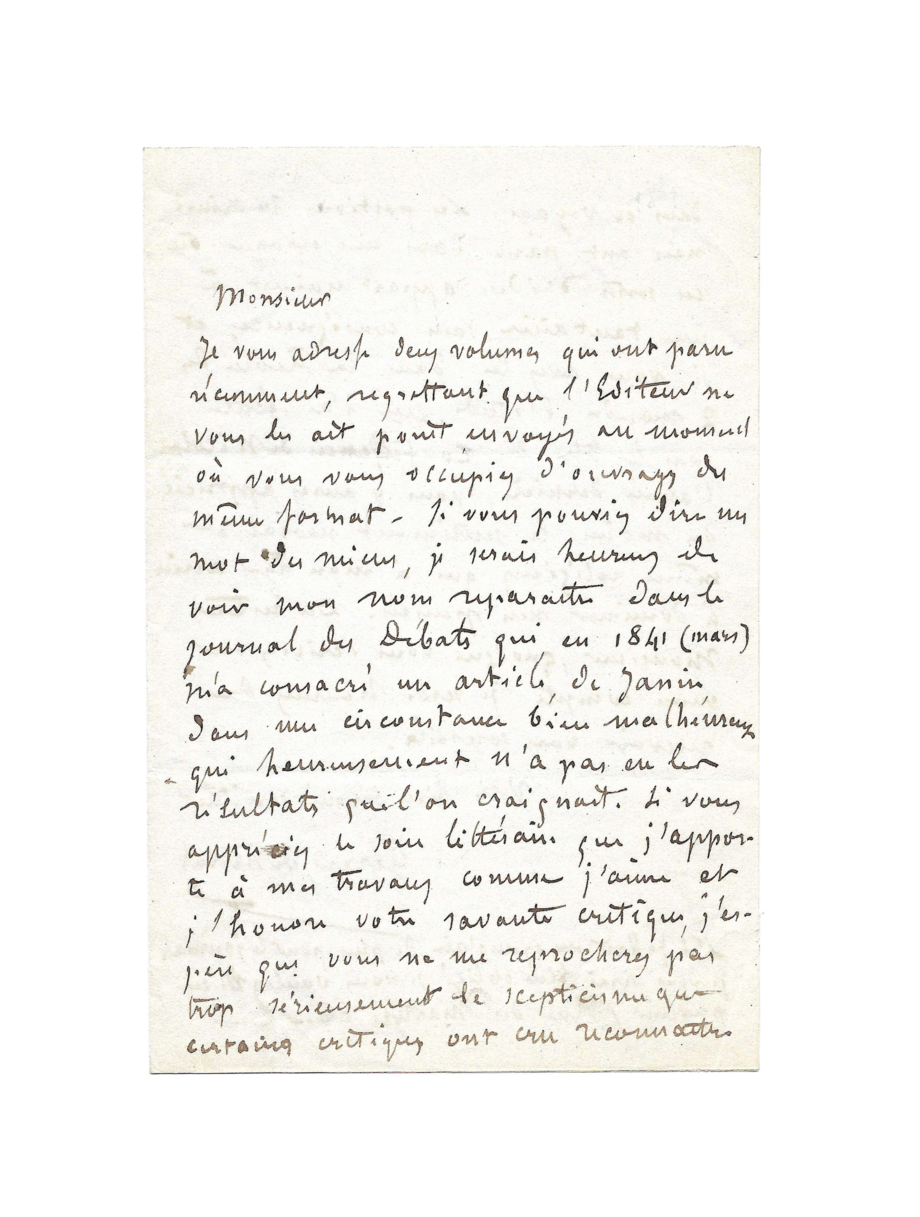 Je vous adresse deux volumes qui ont paru récemment [Voyage en Orient], regrettant que l’Editeur ne vous les ait point envoyés au moment où vous vous occupiez d’ouvrages du même format. Si vous pouviez dire un mot des miens, je serais heureux de voir mon nom reparaître dans le Journal des Débats qui en 1841 (mars) m’a consacré un article de Janin dans une circonstance bien malheureuse qui heureusement n’a pas eu les résultats que l’on craignait.
