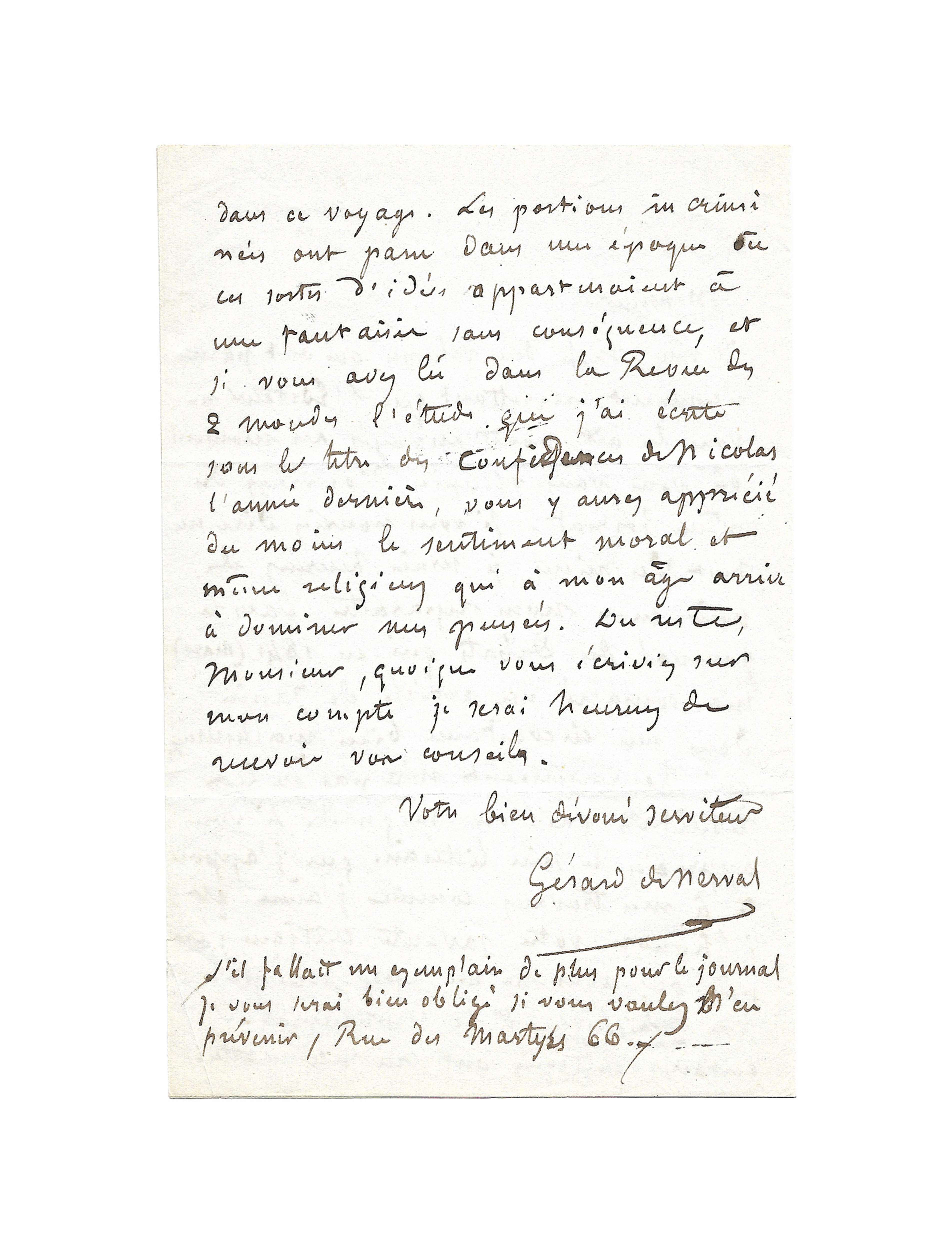 Lettre autographe signée « Gérard de Nerval » à un critique littéraire du Journal des Débats