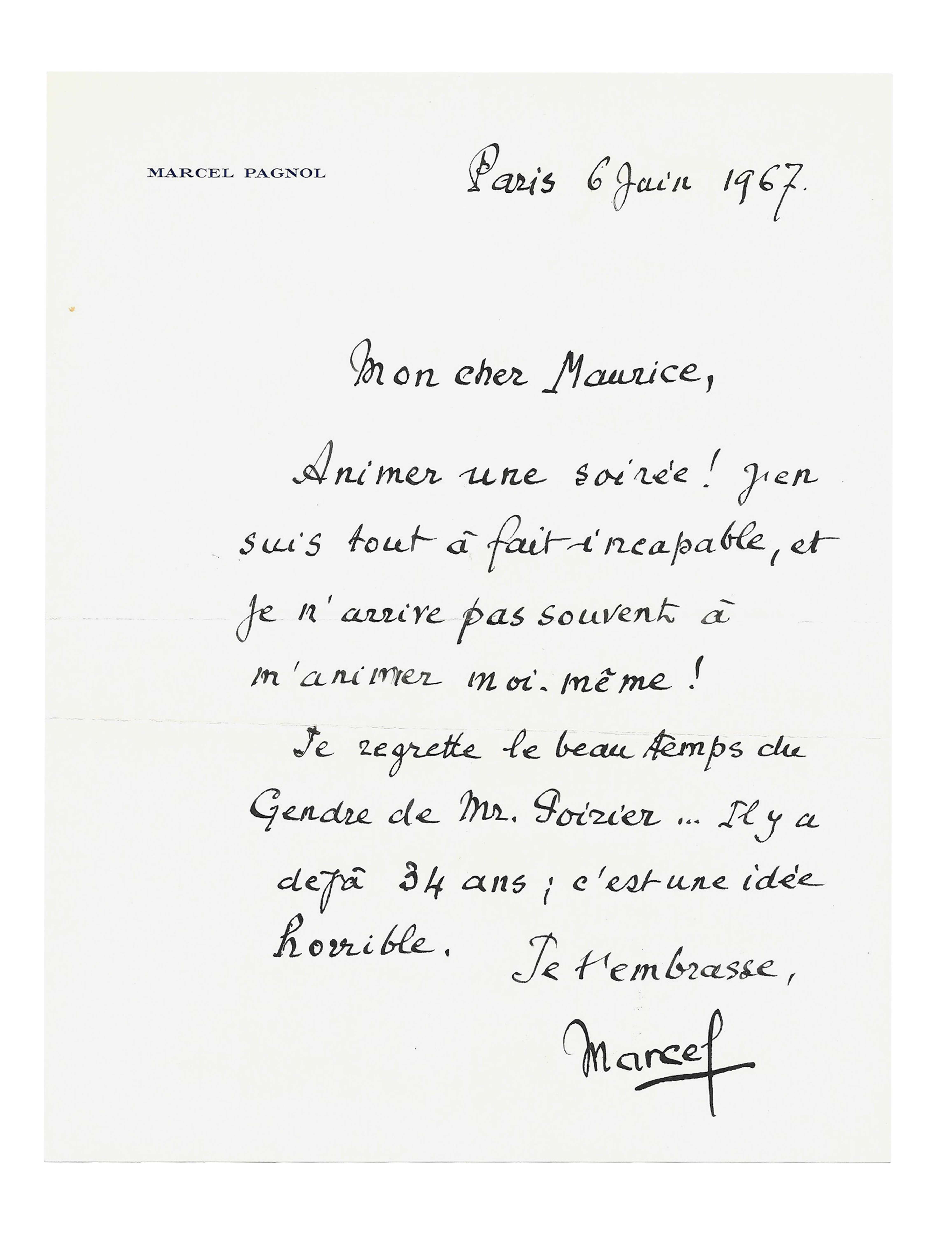 Le nostalgique Pagnol envoie une tendre et amusante lettre à son ami l’acteur Maurice Escande, qui tourna pour son film Le Gendre de monsieur Poirier