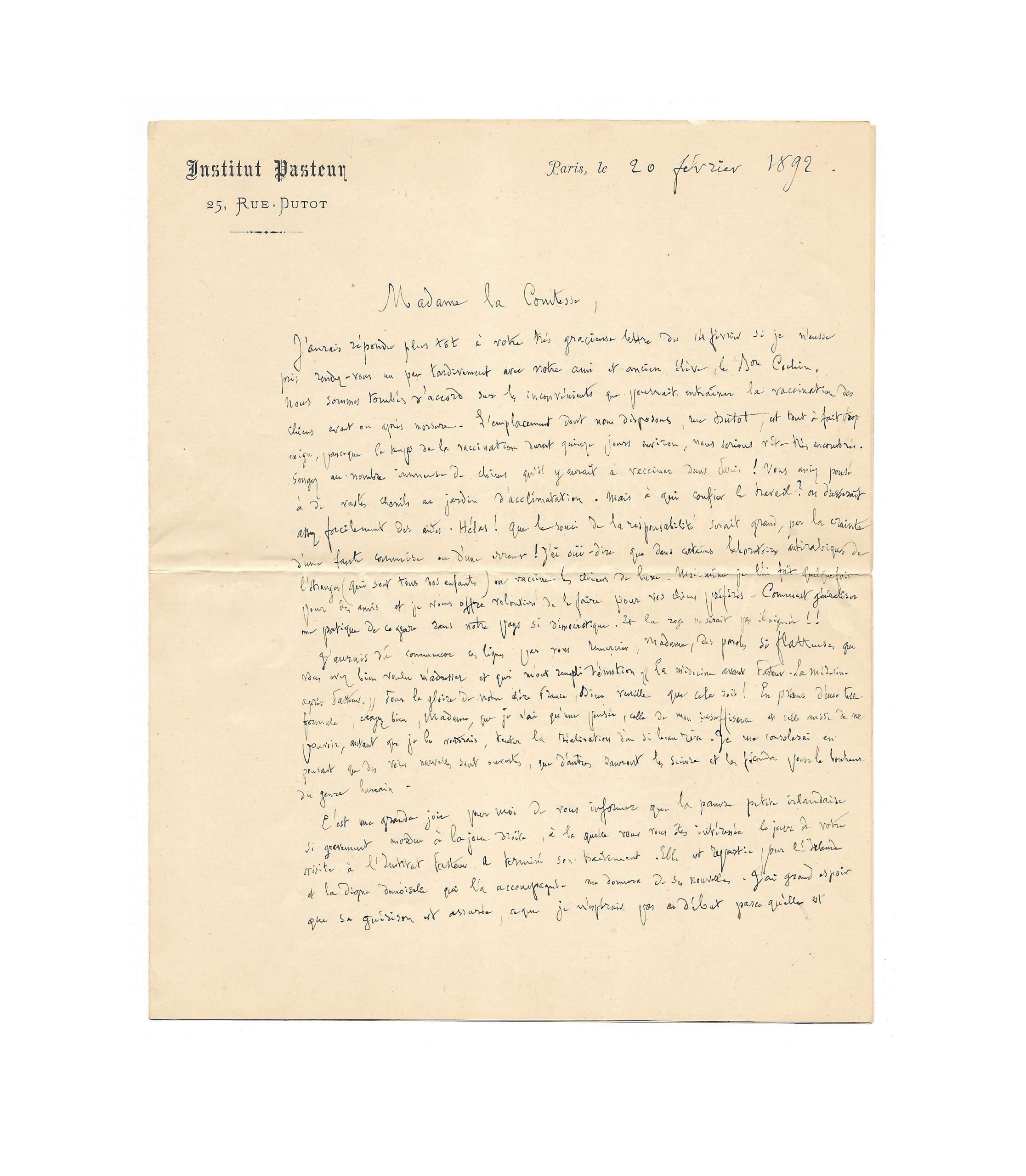 Les célèbres travaux de Pasteur sur la prophylaxie de la rage ont complètement réorienté l’étude de cette maladie. De sa fine écriture, le scientifique répond ici à la comtesse de Greffulhe, ayant demandé à faire vacciner ses chiens favoris et suggéré de généraliser cette pratique. Pasteur présente ses objections et profite de cette lettre pour faire part à sa lectrice d’un épisode sur la récente guérison d’une jeune femme mordue à la joue.