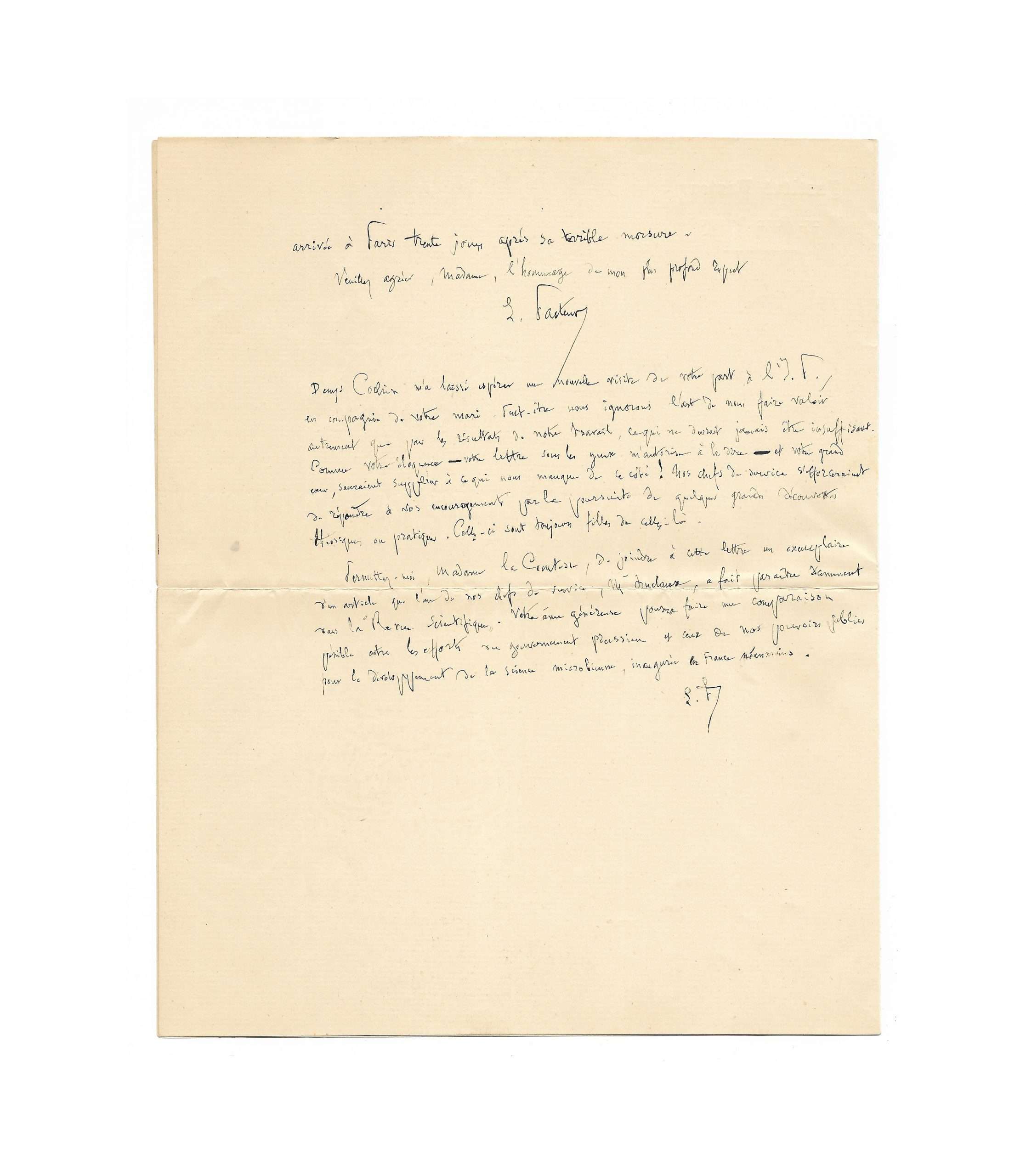 Permettez-moi, Madame la Comtesse, de joindre à cette lettre un exemplaire d’un article que l’un de nos chefs de service, Mr Buclaux, a fait paraître récemment dans la « Revue Scientifique ». Votre âme généreuse pourra faire une comparaison pénible entre les efforts du gouvernement Prussien et ceux de nos pouvoirs publics pour le développement de la science microbienne, inaugurée en France néanmoins. LP »
