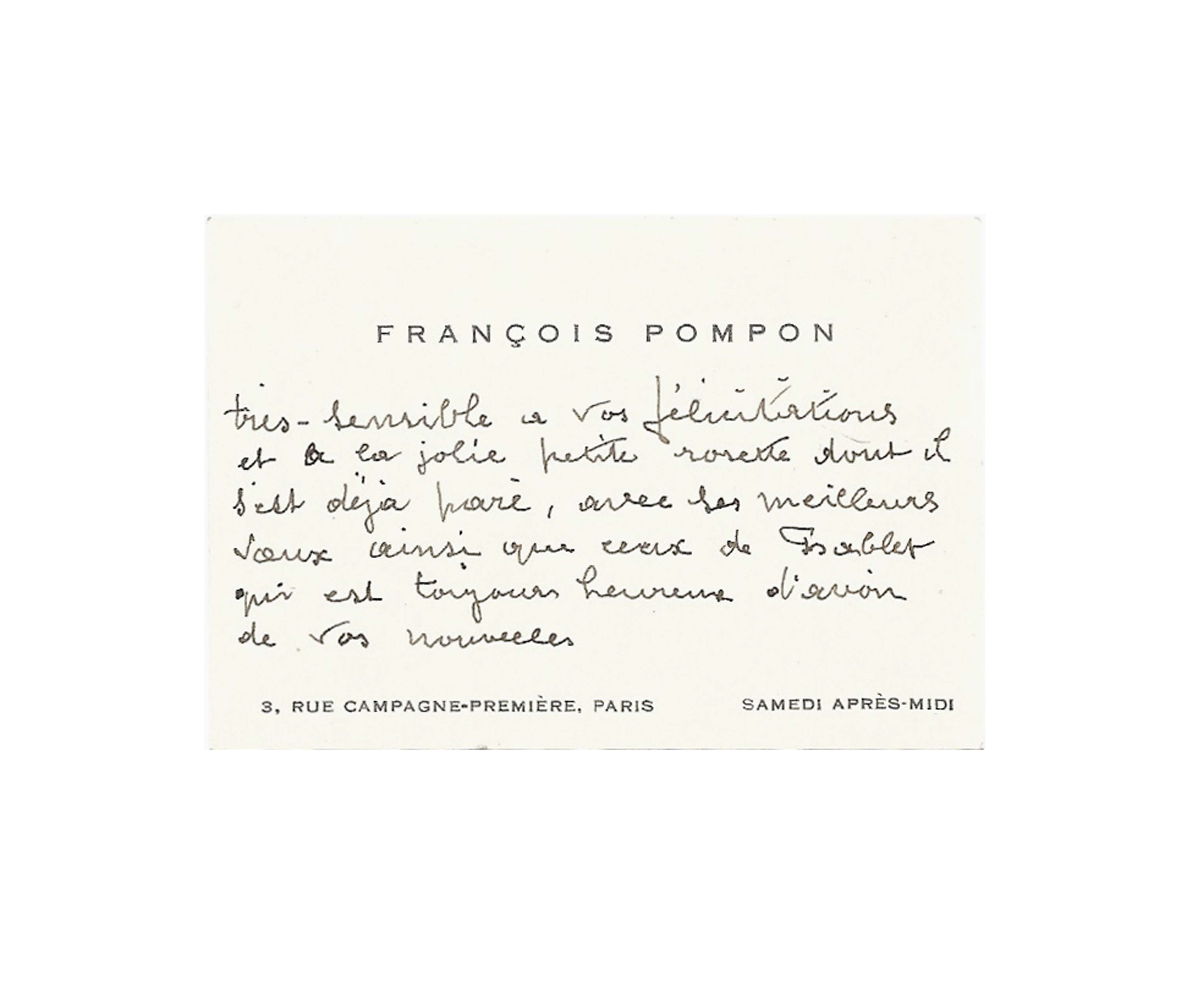 Formé par Aimé Millet et Pierre Louis Rouillard, Pompon entre dans l’atelier d’Auguste Rodin en 1890. Il y travaille comme praticien au dépôt des marbres, rue de l’Université. Très vite, il gagne la confiance du maître, qui lui confie la direction de l’atelier trois ans plus tard. C’est dans ce même atelier qu’il rencontre Camille Claudel. Il prend définitivement le parti de simplifier la forme de ses sculptures à partir de 1905, créant ainsi une empreinte unique et dont l’influence sera décisive sur nombres d’artistes majeurs du XXe siècle. Pompon connaît une consécration tardive lorsqu’il présente son Ours blanc au Salon d’automne de 1922.