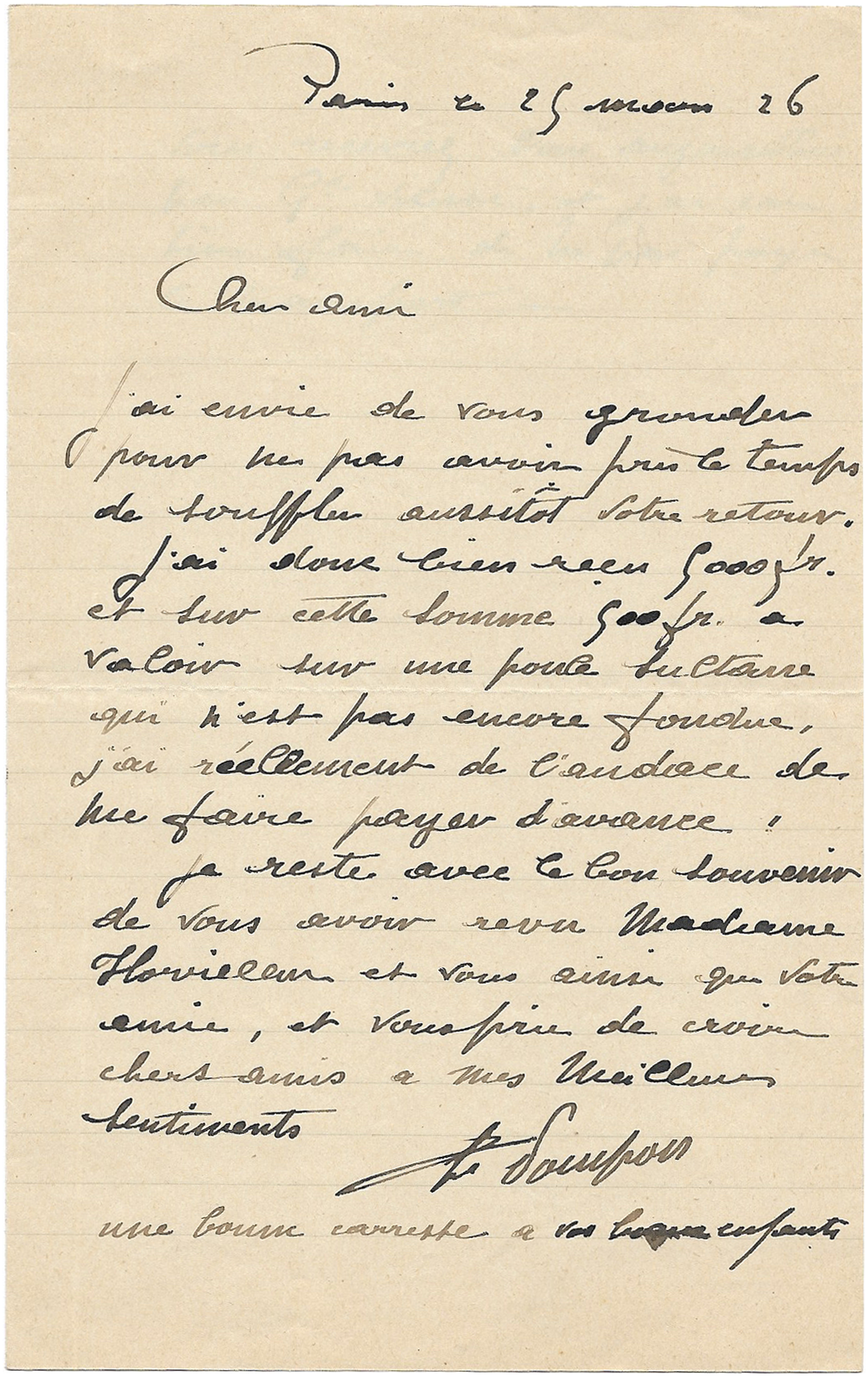 Paris, 25 mars [19]26, 1 p. in-8° à l’encre noire sur papier ligné