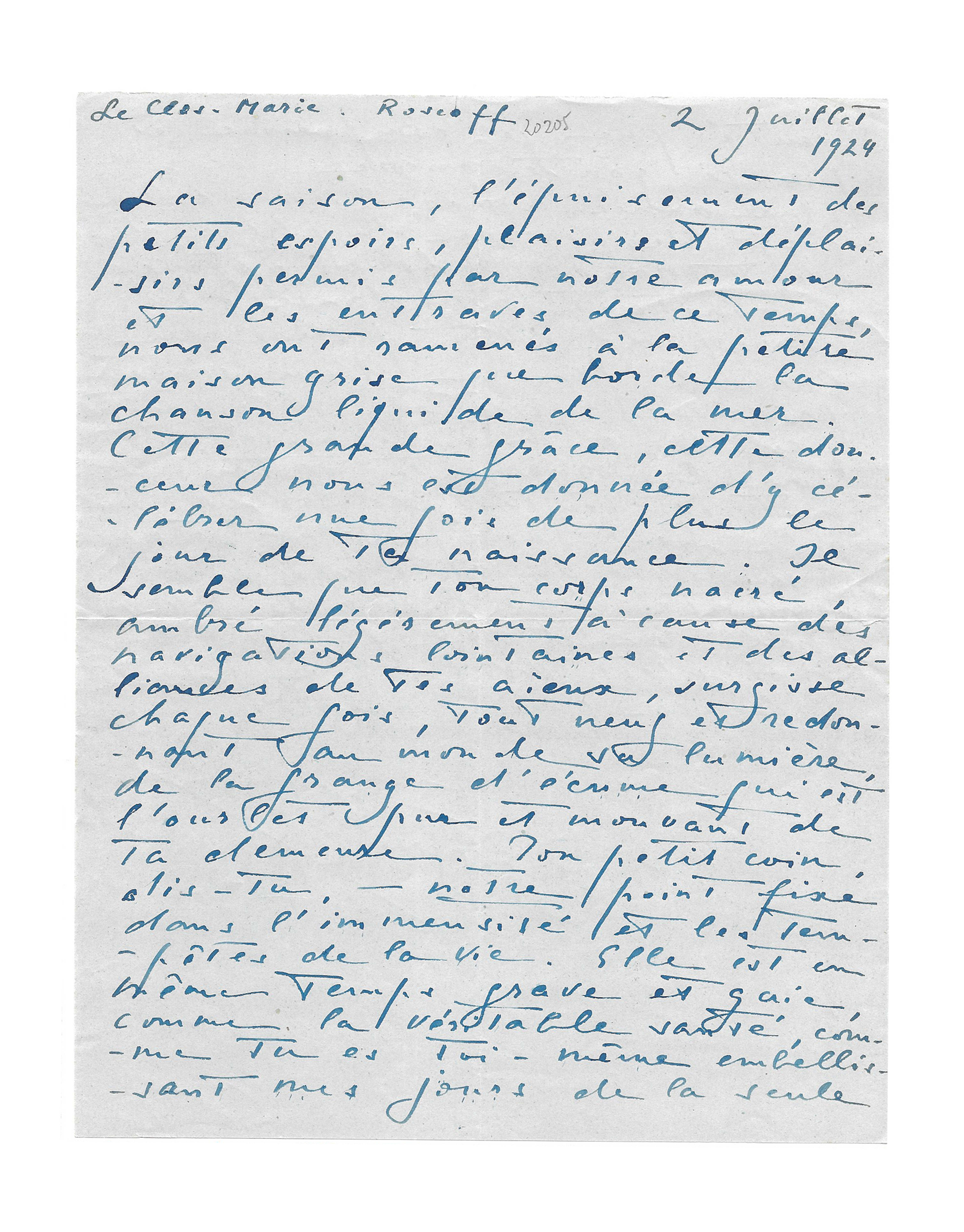 Le Clos-Marie, Roscoff, 2 juillet 1924, 2 p. in-4° à l’encre bleue sur papier gris