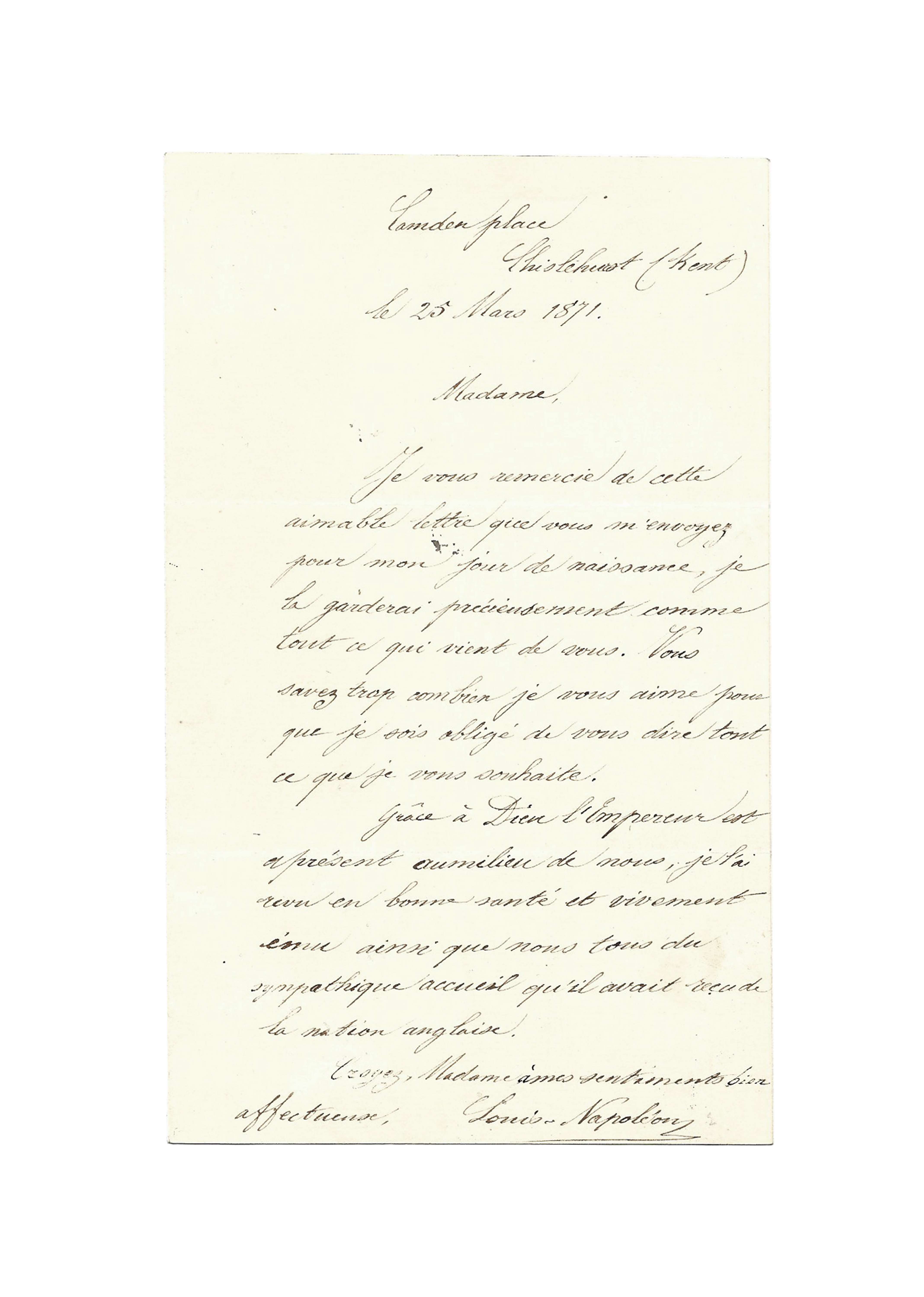 Napoléon III est libéré de sa captivité par Bismarck, le 19 mars 1871, suite à la cuisante défaite des troupes française à Sedan, sept mois plus tôt. Après avoir rejoint les siens à Camden Place, au sud-ouest de Londres, l’Empereur déchu reçoit rapidement de nombreuses visites prestigieuses, à commencer par celle de la reine Victoria. Ce chaleureux accueil de la nation anglaise évoqué ici fait contraste avec le sort réservé en France, au même moment, à la famille impériale : Le 1er, l’Assemblée Nationale qui s’est réunie à Bordeaux, vote la déchéance officielle de Napoléon III et de sa dynastie, le déclarant « responsable de la ruine, de l’invasion et du démembrement de la France ». Seuls six parlementaires votent contre. L’Empereur ainsi déchu proteste, accusant l’Assemblée d’outrepasser ses pouvoirs, de se substituer à la volonté de la Nation et réclame un plébiscite. La Troisième République allait cependant devoir gérer une crise autrement grave, la Commune de Paris, débutée le 18 mars, soit une semaine avant la rédaction de cette lettre.