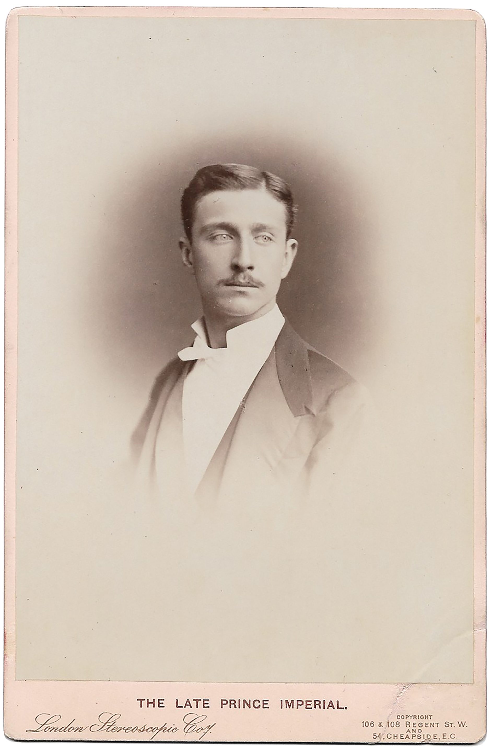 Le jeune prince est ici portraituré durant ses années d’exil en Angleterre. On retrouve dans ce cliché son regard légèrement mélancolique hérité de sa mère l’impératrice Eugénie. D’une élégance rare, il porte une chemise à col cassé « white tie » aux petites ailes rigides, accompagnée d’une veste noire parfaitement ajustée.