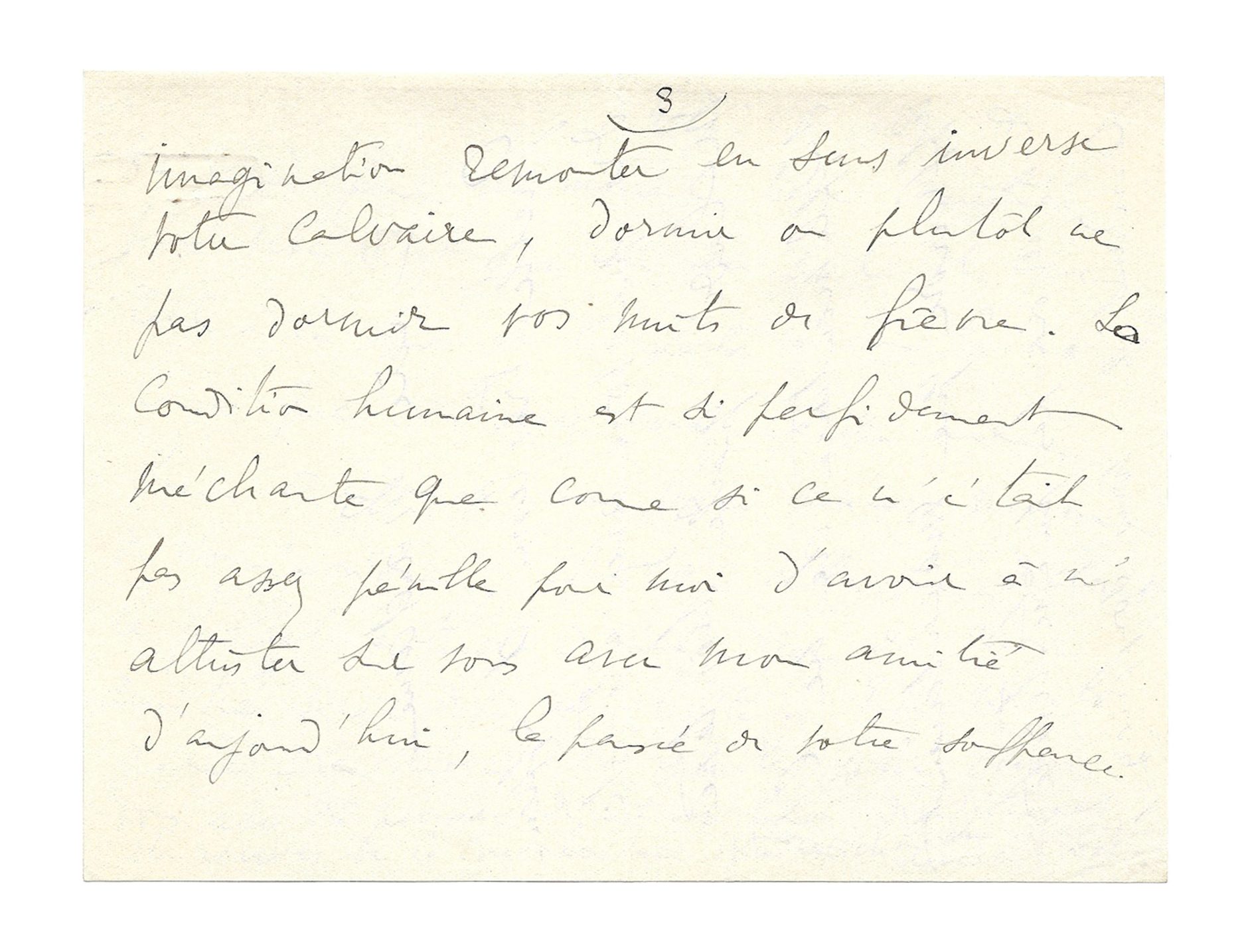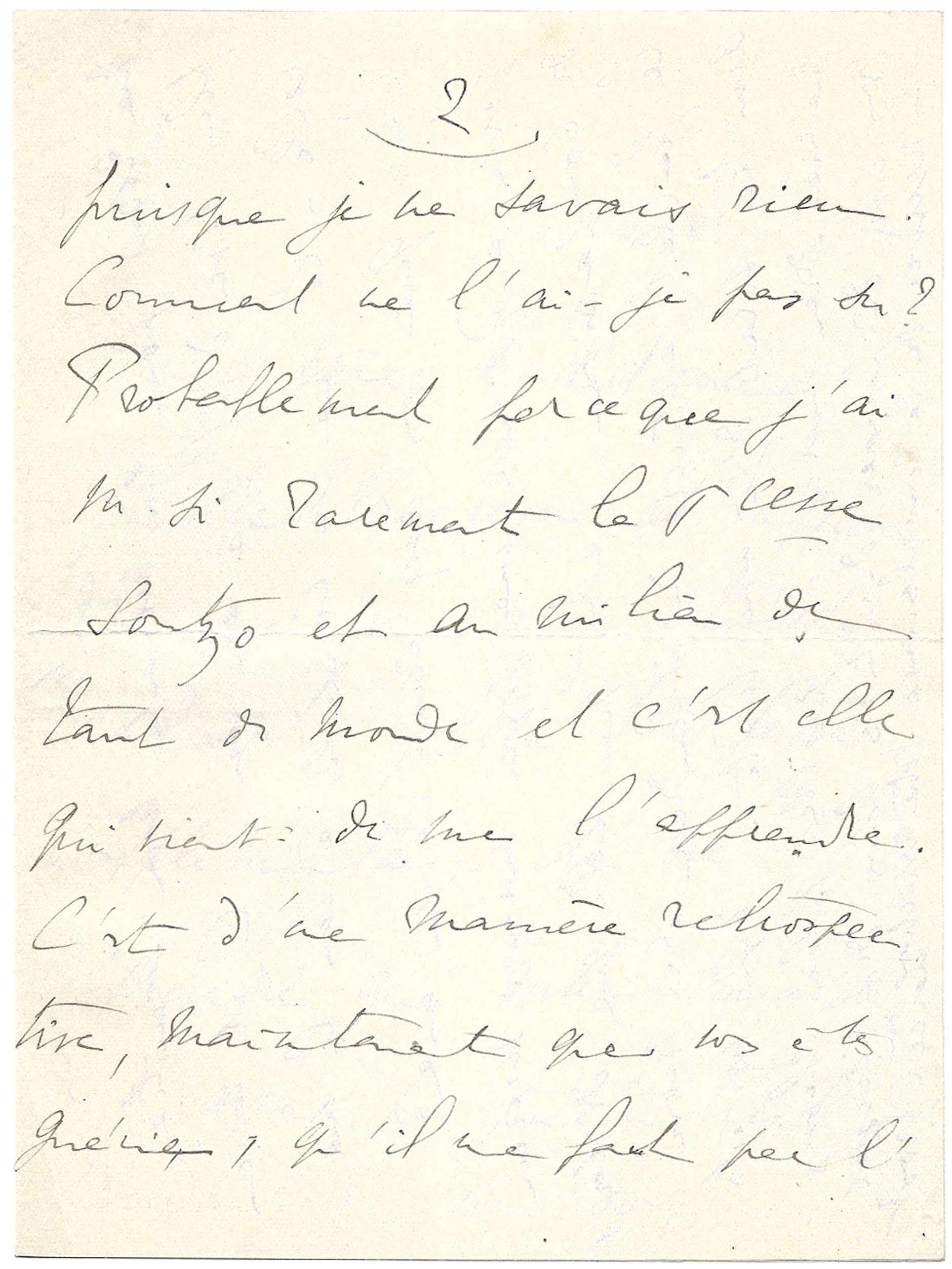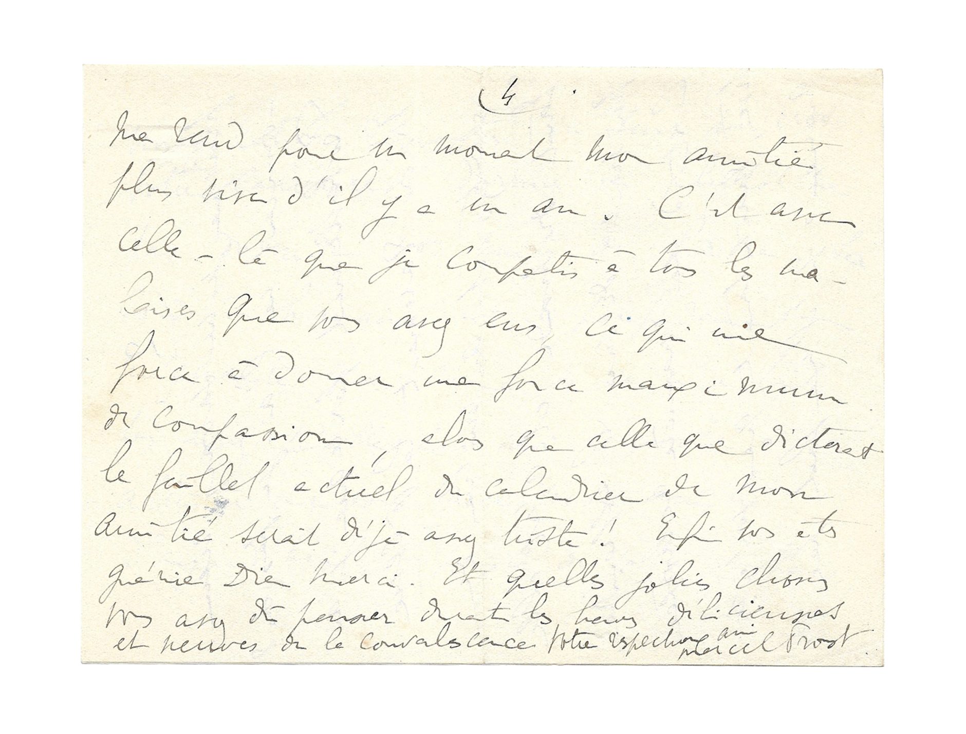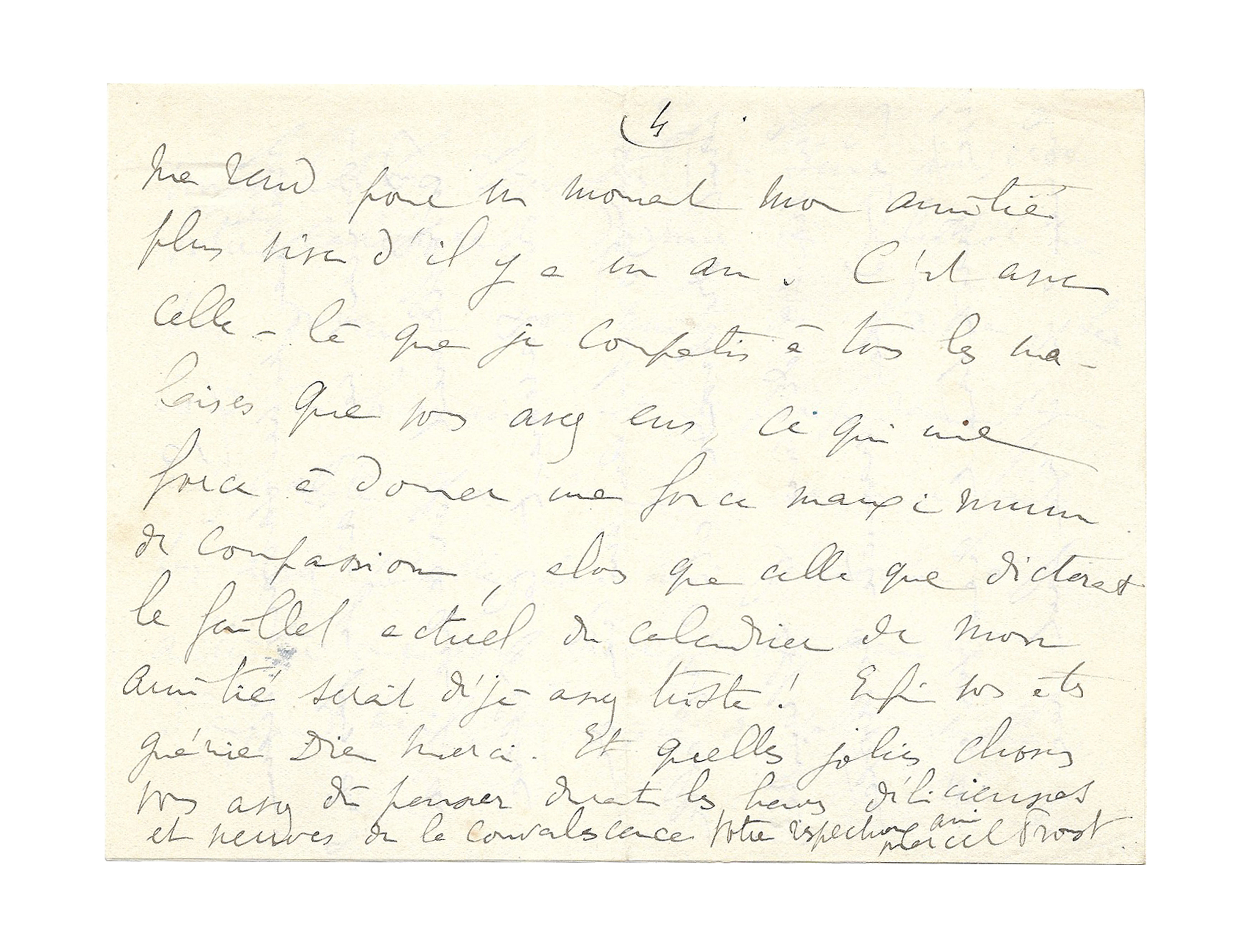 C’est d’une manière rétrospective, maintenant que vous êtes guérie, qu’il me faut par l’imagination remonter en sens inverse de votre calvaire, dormir ou plutôt ne pas dormir vos nuits de fièvre. La condition humaine est si perfidement méchante que, comme si ce n’était pas assez pénible pour moi d’avoir à m’attrister sur vous avec mon amitié d’aujourd’hui, le passé de votre souffrance me rend pour un moment mon amitié plus vive qu’il y a un an. C’est avec celle-là que je compatis à tous les malaises que vous avez eus, ce qui me force à donner une force maximum de compassion, alors que celle que dicterait le feuillet actuel du calendrier de mon amitié serait déjà assez triste ! Enfin vous êtes guérie, Dieu merci. Et quelles jolies choses vous avez dû penser durant les heures délicieuses et neuves de convalescence.