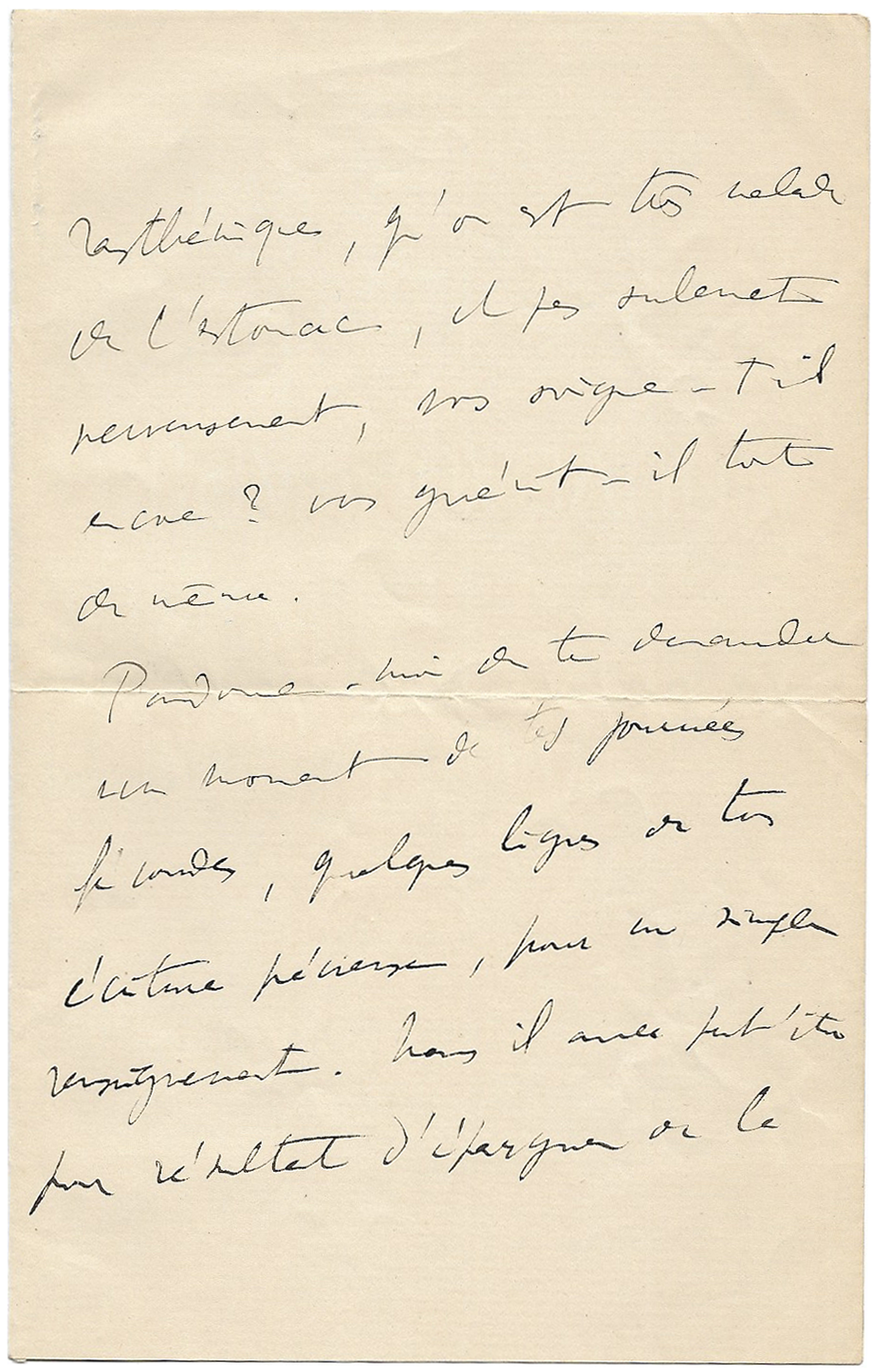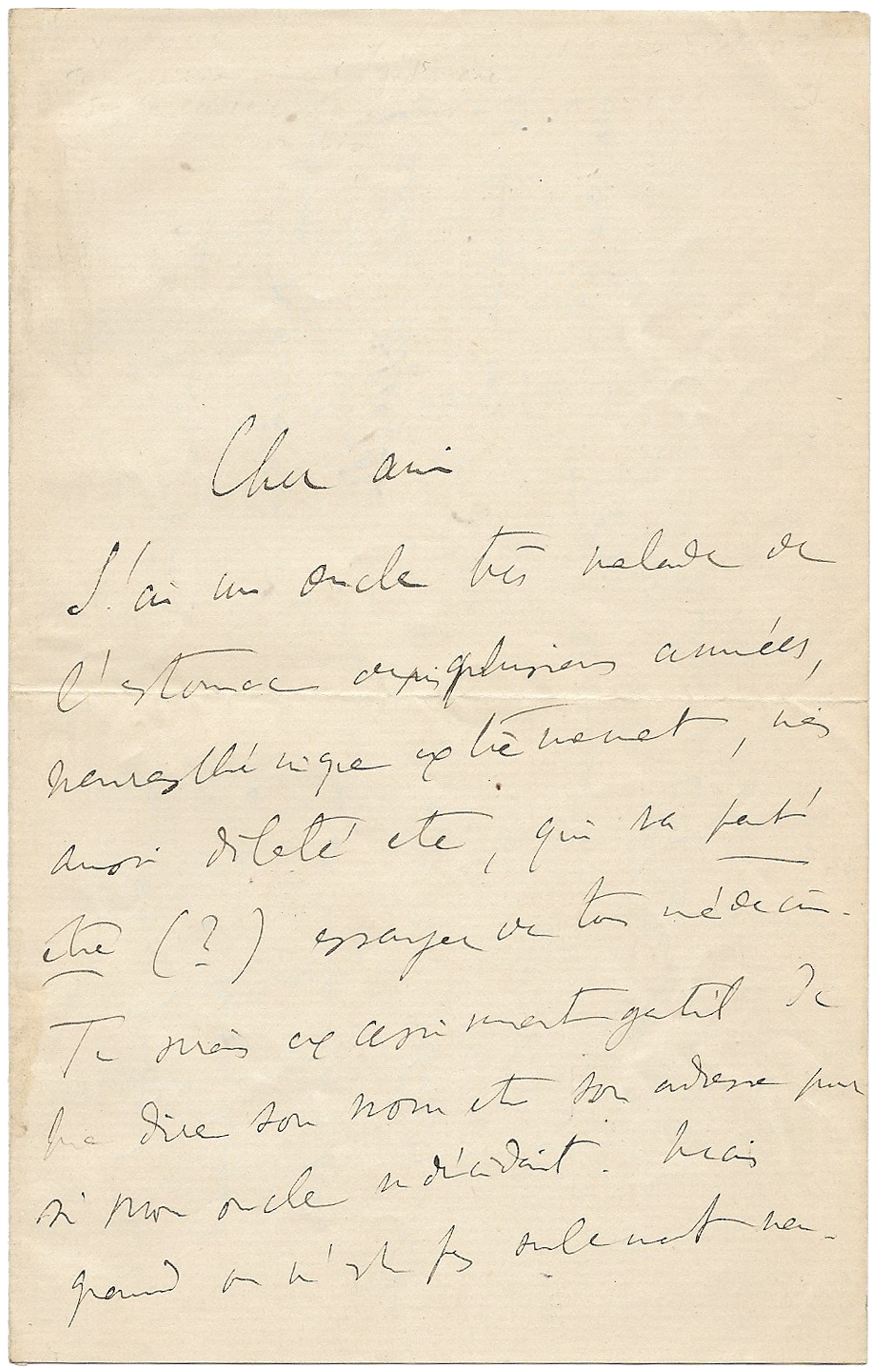 « Cher ami, j’ai un oncle très malade de l’estomac depuis plusieurs années, neurasthénique extrêmement, mais aussi dilaté, etc., qui va peut-être (?) essayer de ton médecin [le docteur Dubois]. Tu serais excessivement gentil de me dire son nom et son adresse pour si mon oncle se décidait. Mais quand on n’est pas seulement neurasthénique, qu’on est très malade de l’estomac, et pas seulement nerveusement, vous soigne-t-il encore ? Vous guérit-il tout de même.