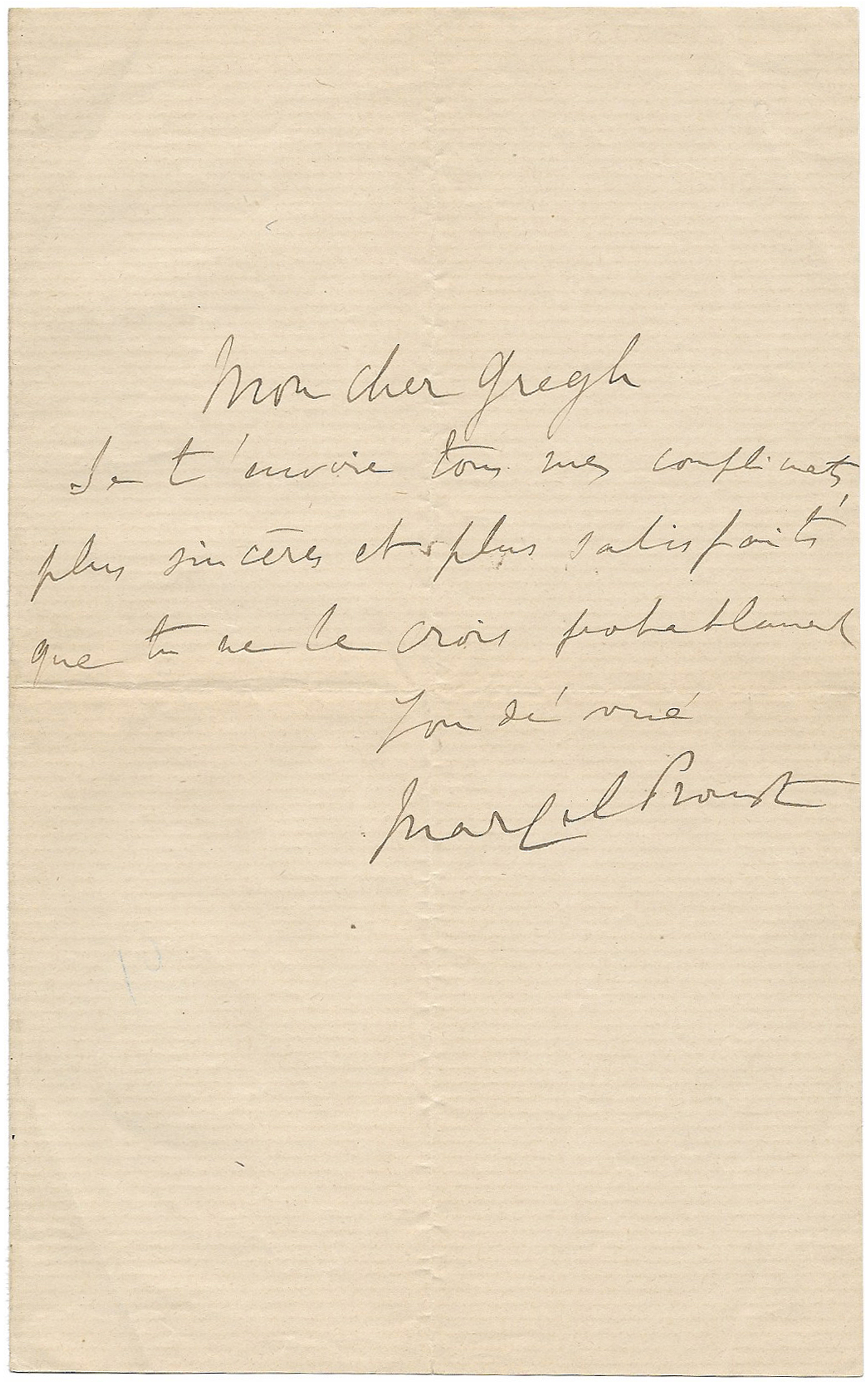 Lettre autographe signée « Marcel Proust » à Fernand Gregh