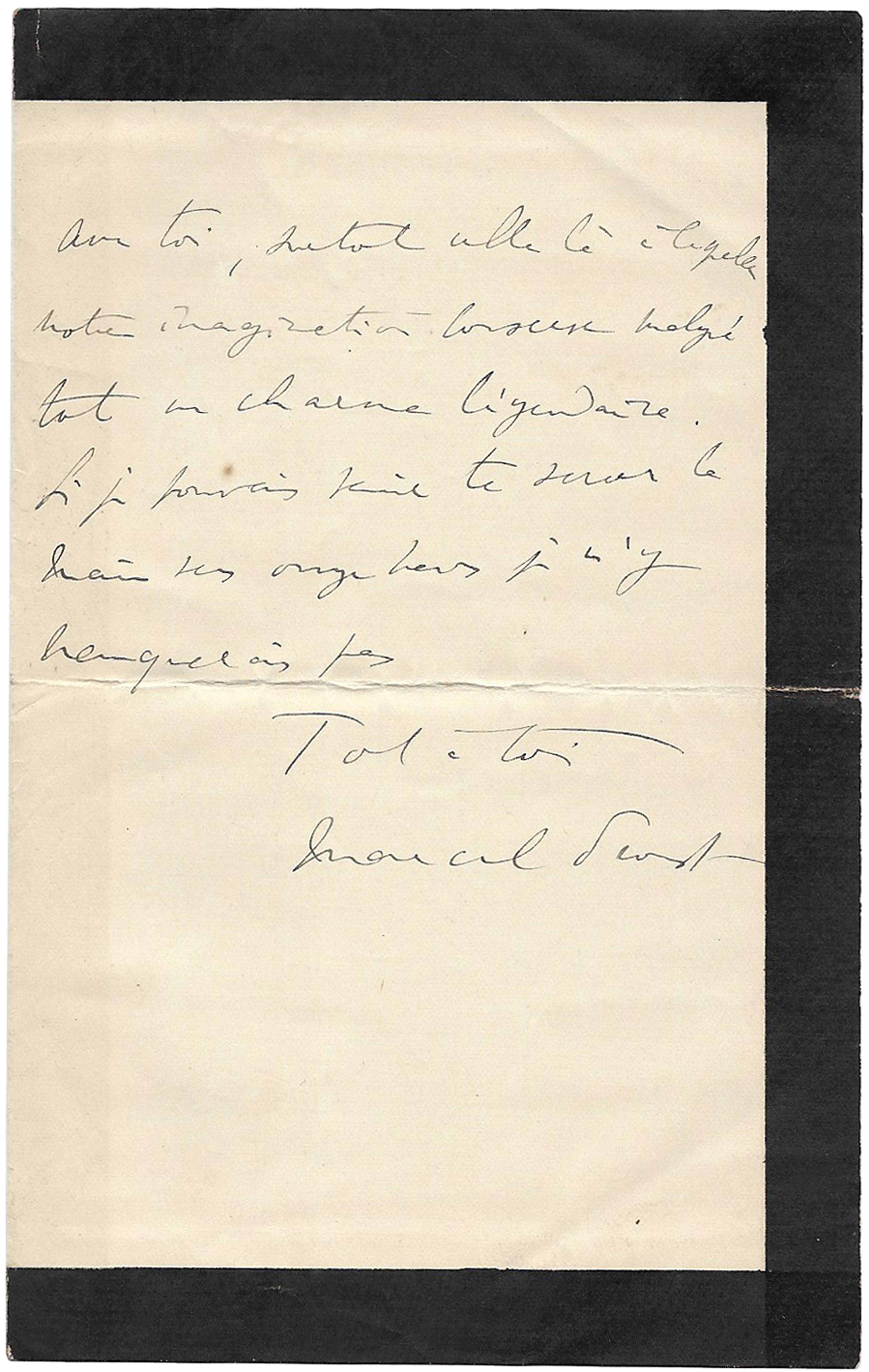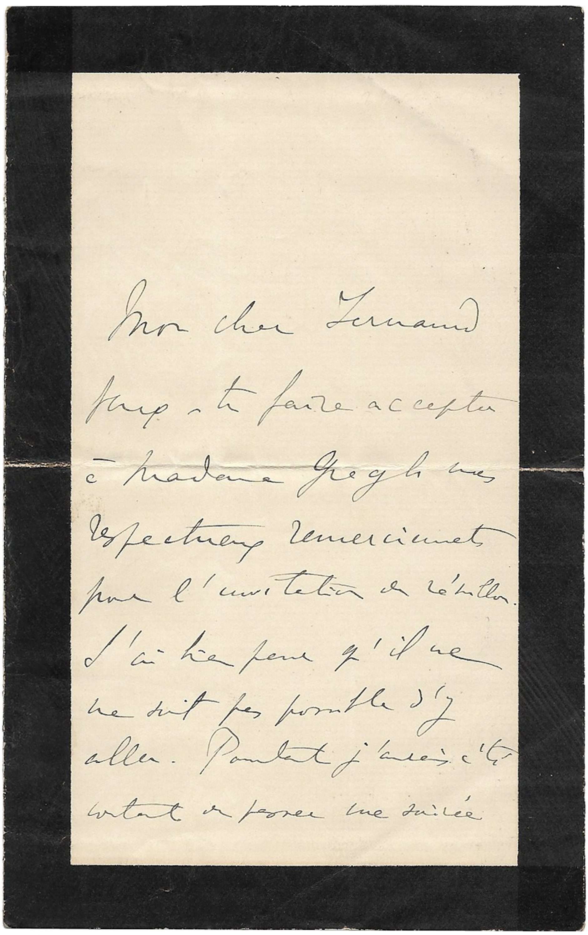 « Mon cher Fernand, veux-tu faire accepter à madame Gregh mes respectueux remerciements pour l’invitation du réveillon. J’ai bien peur qu’il ne me soit pas possible d’y aller. Pourtant j’aurais été content de passer une soirée avec toi, surtout celle-là à laquelle notre imagination conserve malgré tout un charme légendaire. Si je pouvais venir te serrer la main vers onze heures, je n’y manquerais pas.