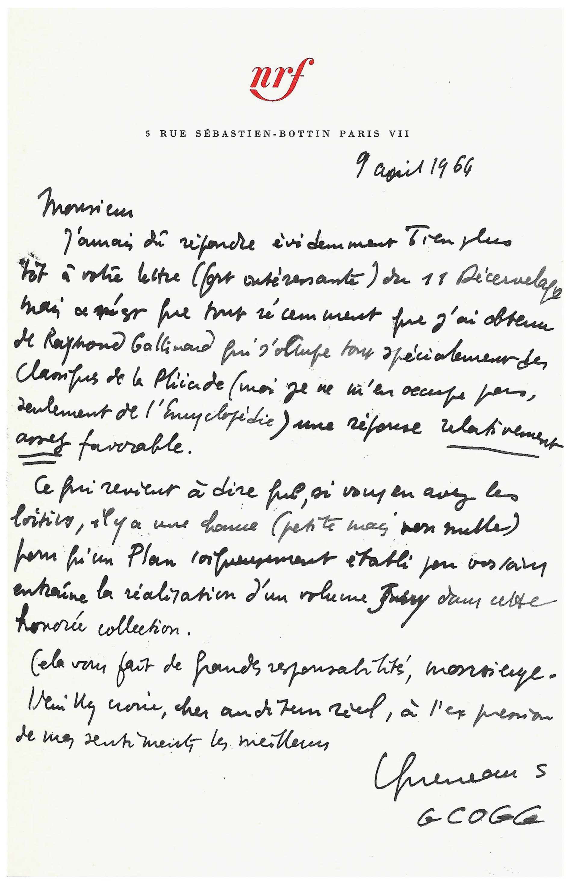 J’aurais dû répondre évidemment bien plus tôt à votre lettre (fort intéressante) du 11 décembre mais ce n’est que tout récemment que j’ai obtenu de Raymond Gallimard qui s’occupe tout spécialement des classiques de la Pléiade (moi je ne m’en occupe pas, seulement de l’Encyclopédie) une réponse relativement assez favorable.