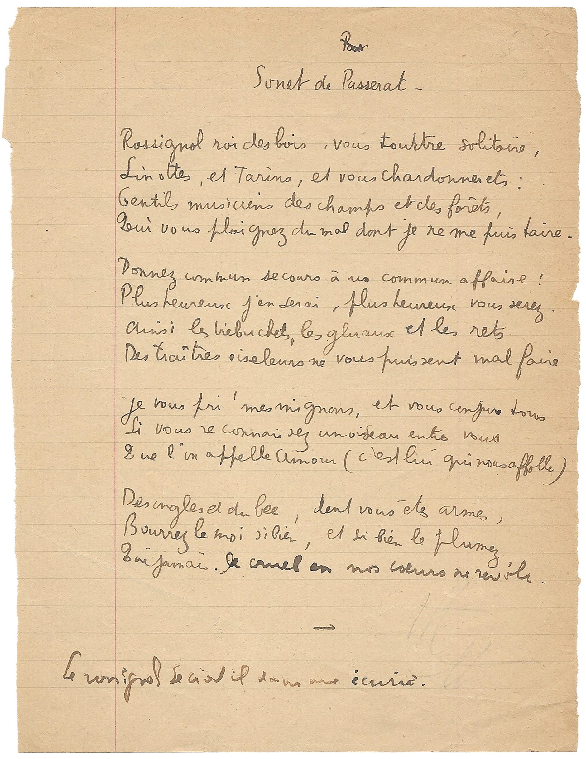 « Rossignol roi des bois » paraît pour la première fois en 1606 dans le recueil des œuvres poétiques de Jean Passerat. Le poète humaniste étant décédé en 1602, le recueil est posthume et c’est son neveu, Jean de Rougevalet, qui en assure la première publication.