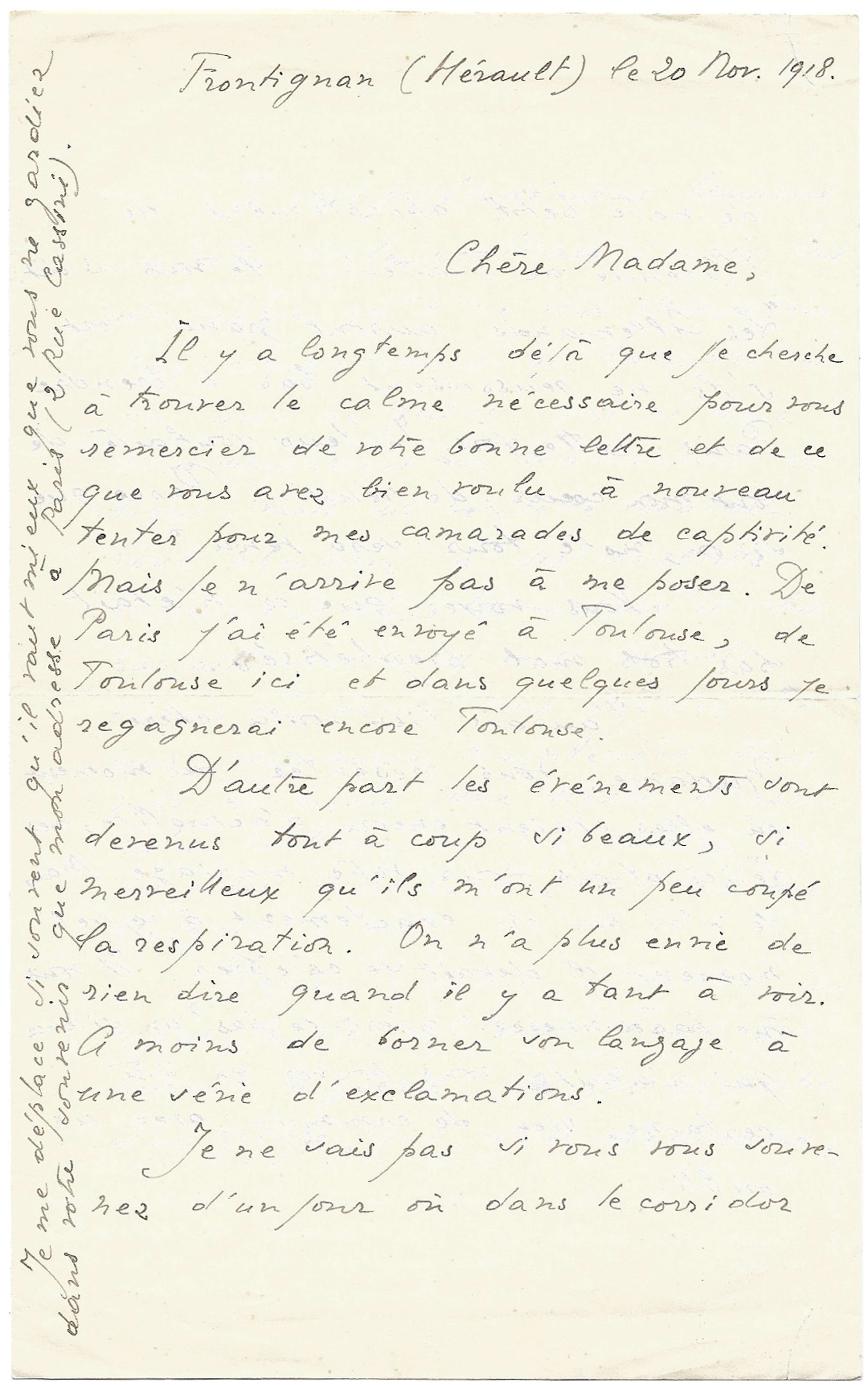 Frontignan, 20 nov. 1918, 4 pp. in-8° à l’encre noire
