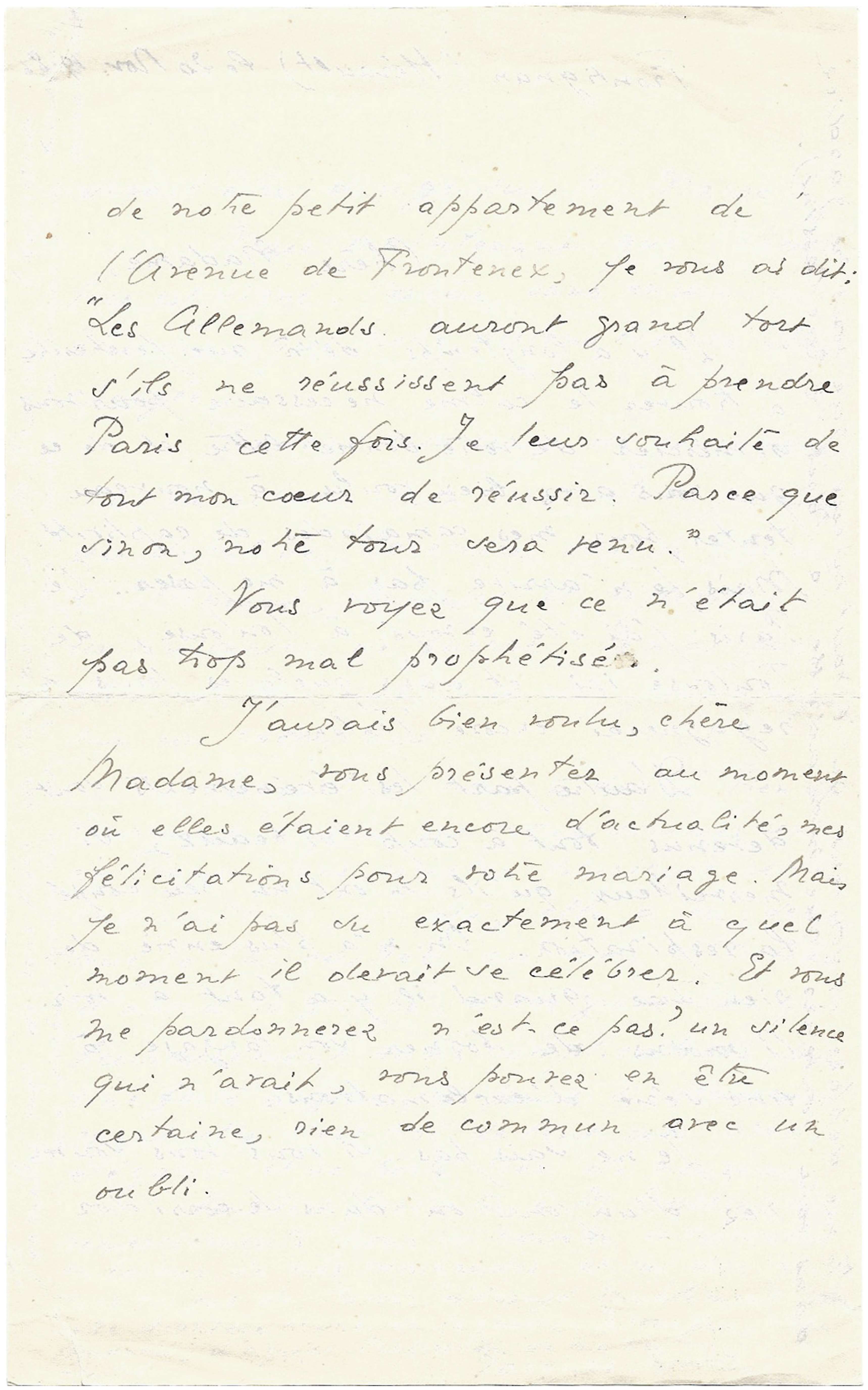Je ne sais pas si vous vous souvenez d’un jour où dans le corridor de notre petit appartement de l’avenue de Frontenex [à Genève], je vous ai dit : « Les Allemands auront grand tort s’ils ne réussissent pas à prendre Paris cette fois [allusion au siège de Paris de 1870]. Je Je leur souhaite de tout mon cœur de réussir. Parce que sinon, notre tour sera venu. »