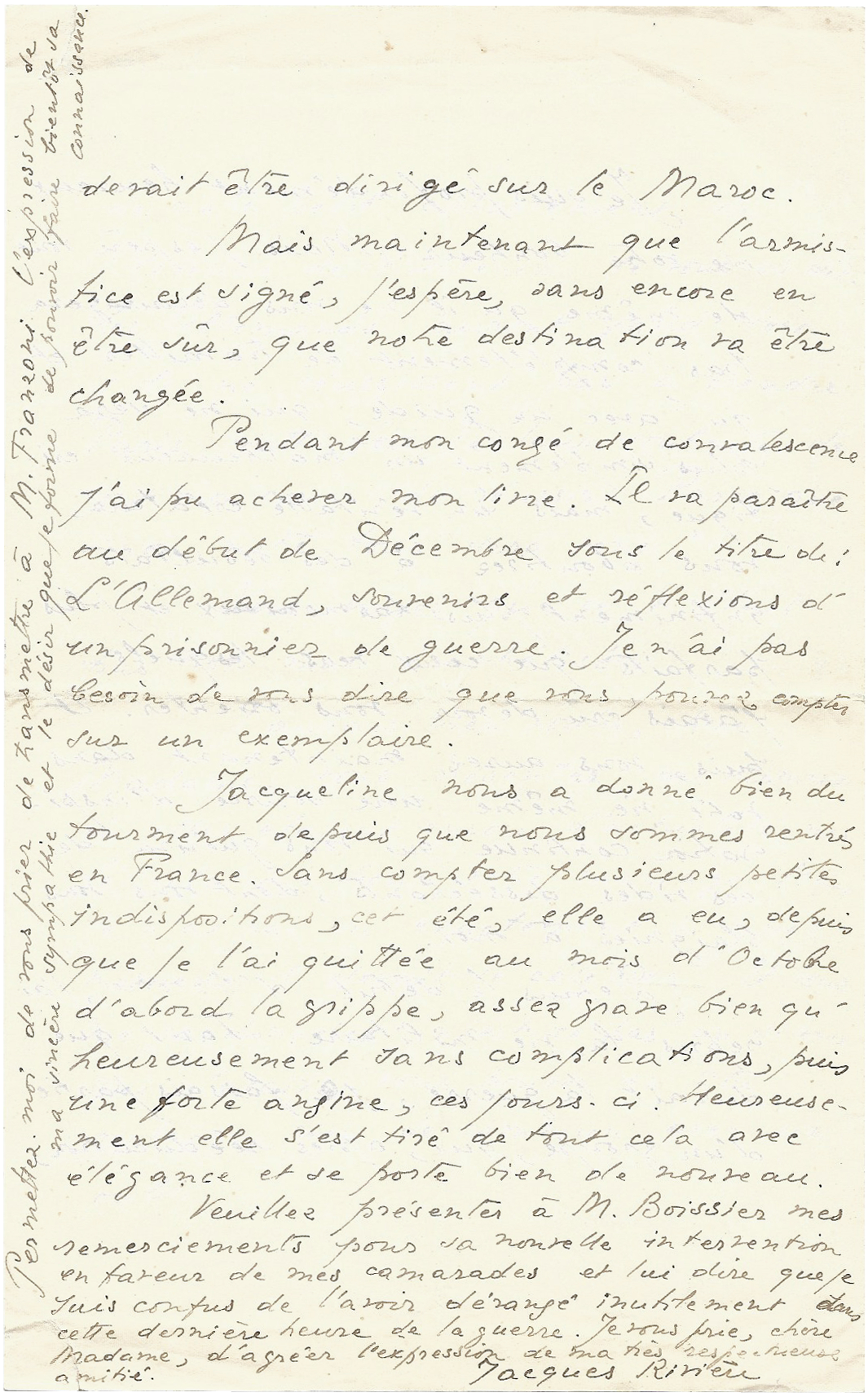 Longue lettre inédite de Jacques Rivière évoquant pêle-mêle sa situation personnelle au sortir de la Grande Guerre, saluant l’armistice et annonçant son prochain roman à paraître : L’Allemand, souvenirs et réflexions d’un prisonnier de guerre