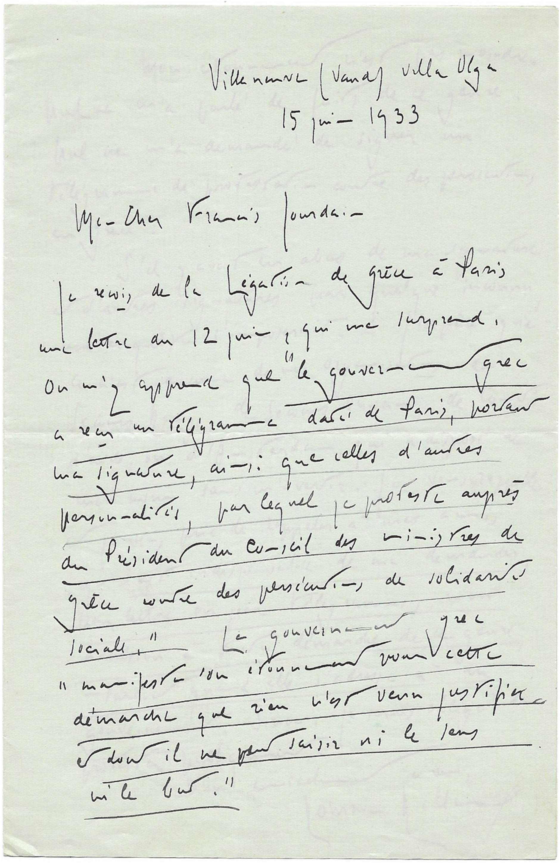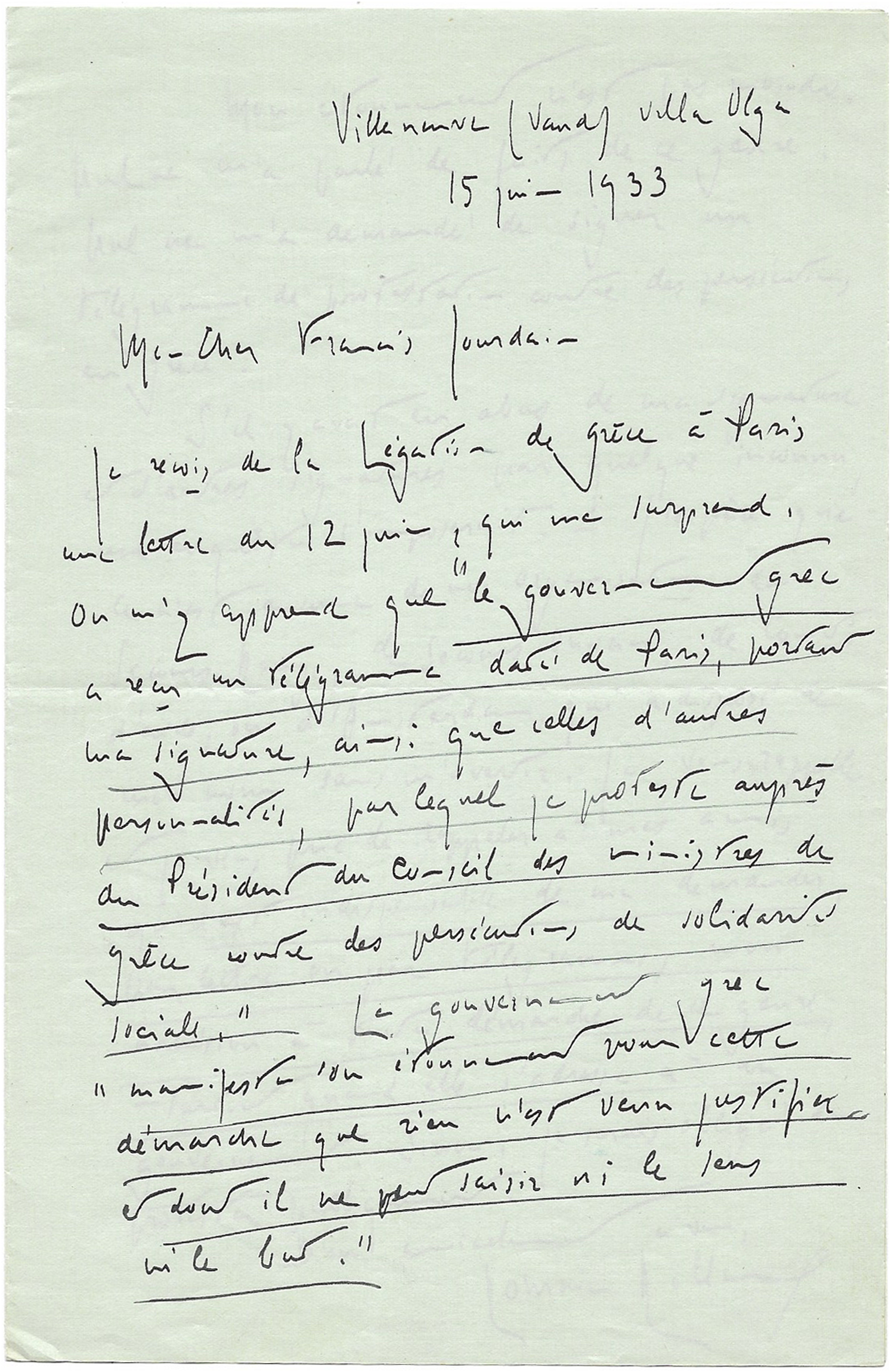 On m’y apprend que ‘le gouvernement grec a reçu un télégramme daté de Paris, portant ma signature, ainsi que celles d’autres personnalités, par lequel je proteste auprès du Président du conseil des ministres de Grèce [Panagís Tsaldáris] contre des persécutions de solidarités sociales.’ Le gouvernement grec « manifeste son étonnement pour cette démarche que rien n’est venu justifier, et dont il ne peut saisir ni le sens nui le but.’