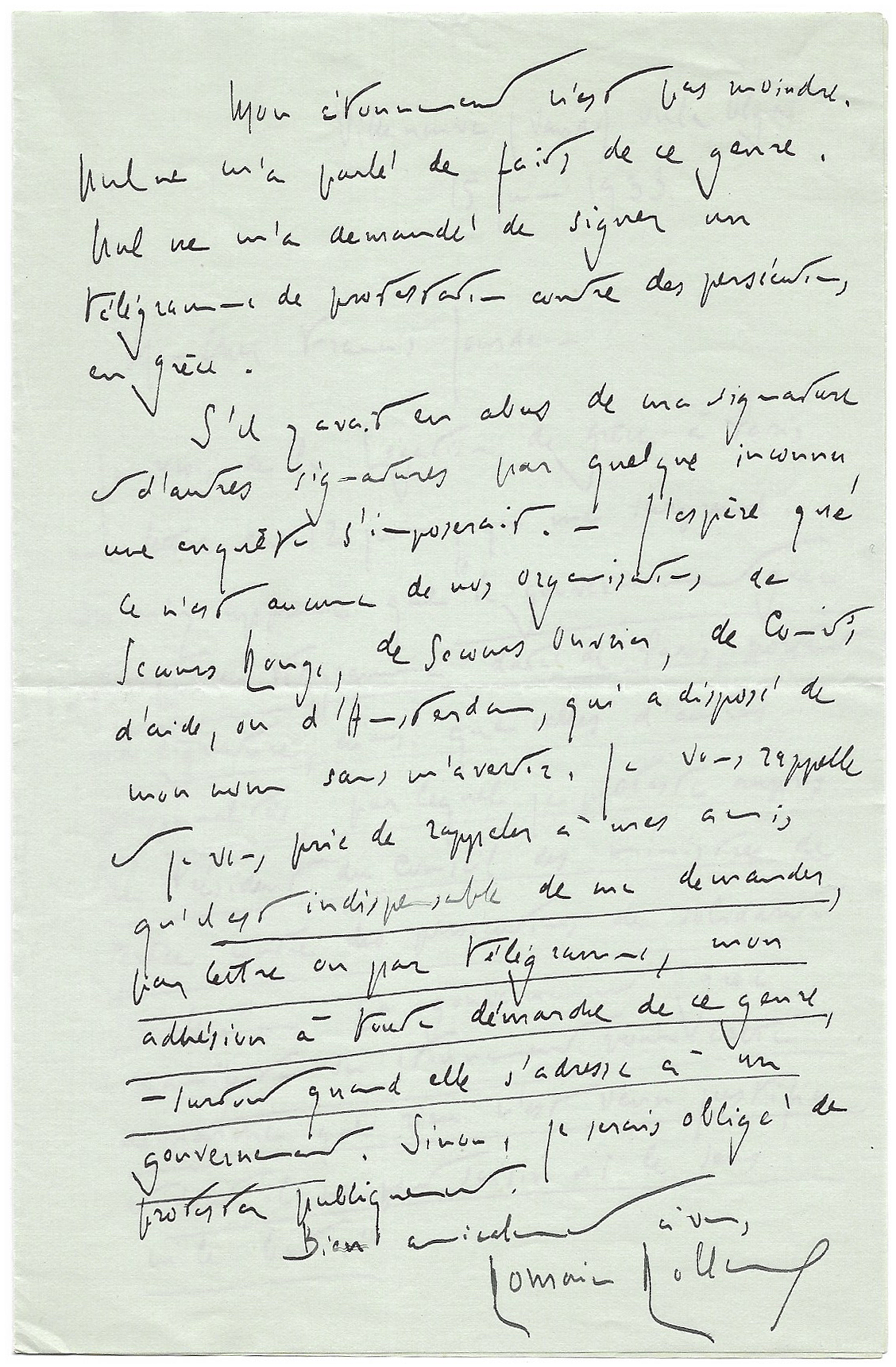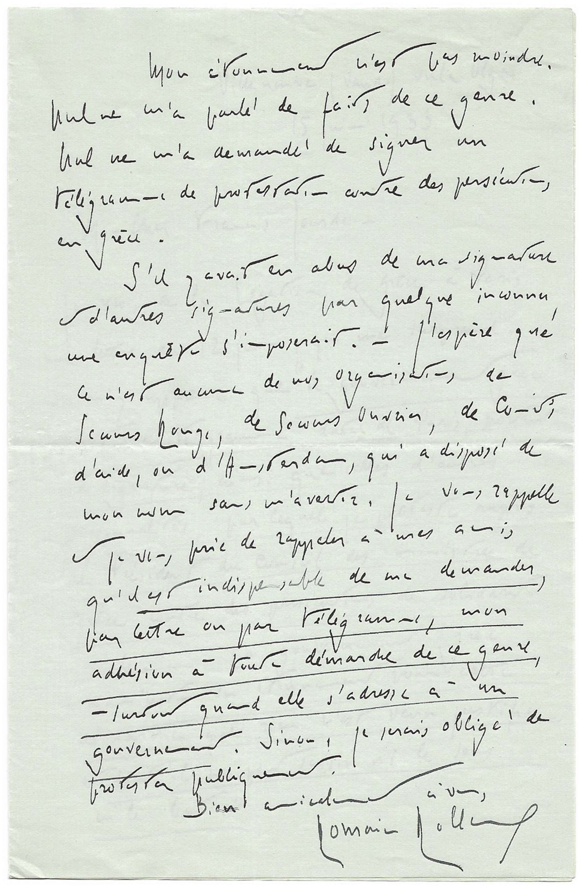 Lettre signalée mais non transcrite dans l’inventaire des Autographes de Romain Rolland (dir. Bernard Duchatelet)
