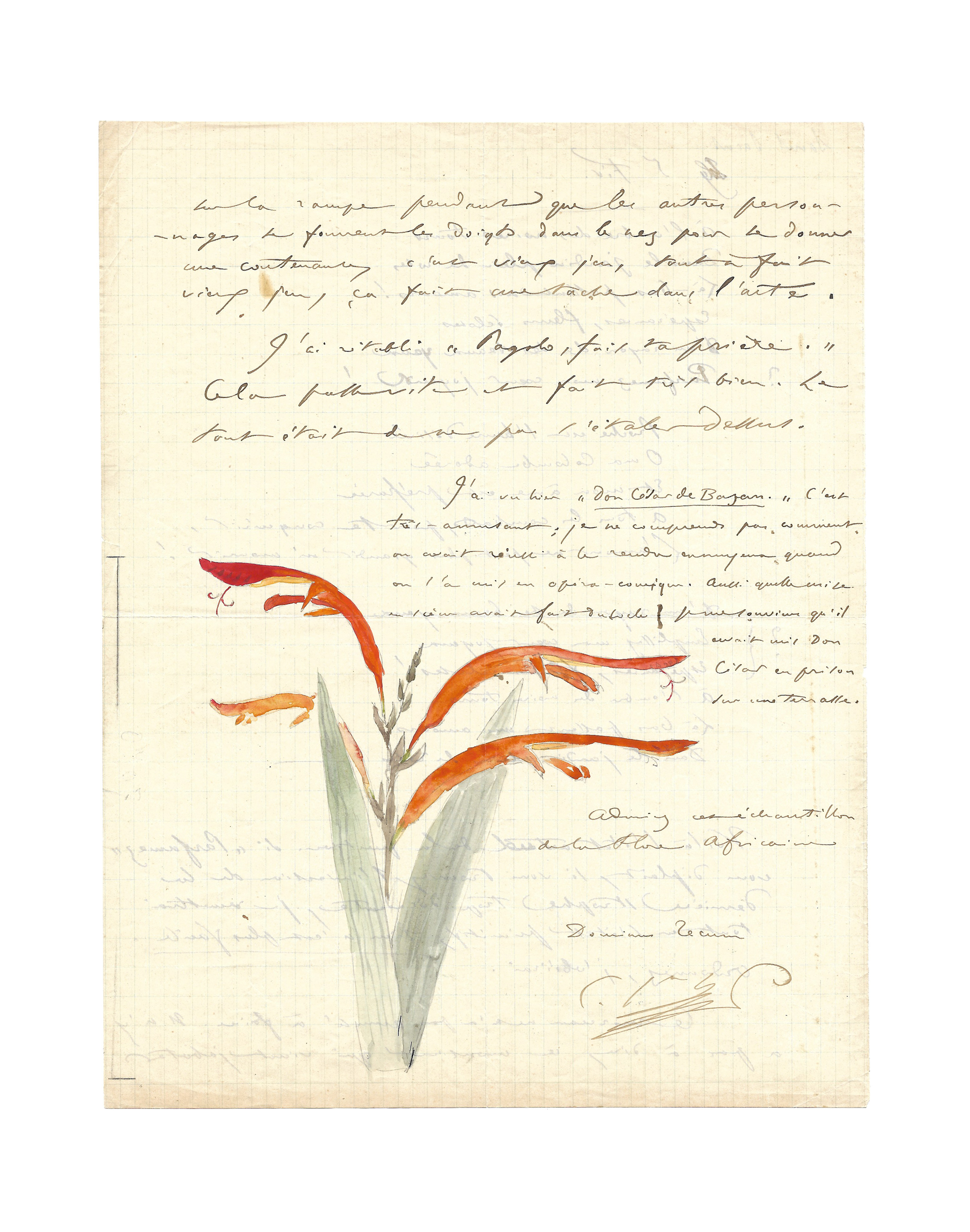 Très belle lettre de Saint-Saëns au sujet de la rédaction de son opéra Ascanio et enrichie d’un poème dont il est tiré – Le compositeur termine sa lettre en évoquant Don César de Bazan de Jules Massenet et l’orne d’un dessin original en couleur représentant une fleur d’Afrique