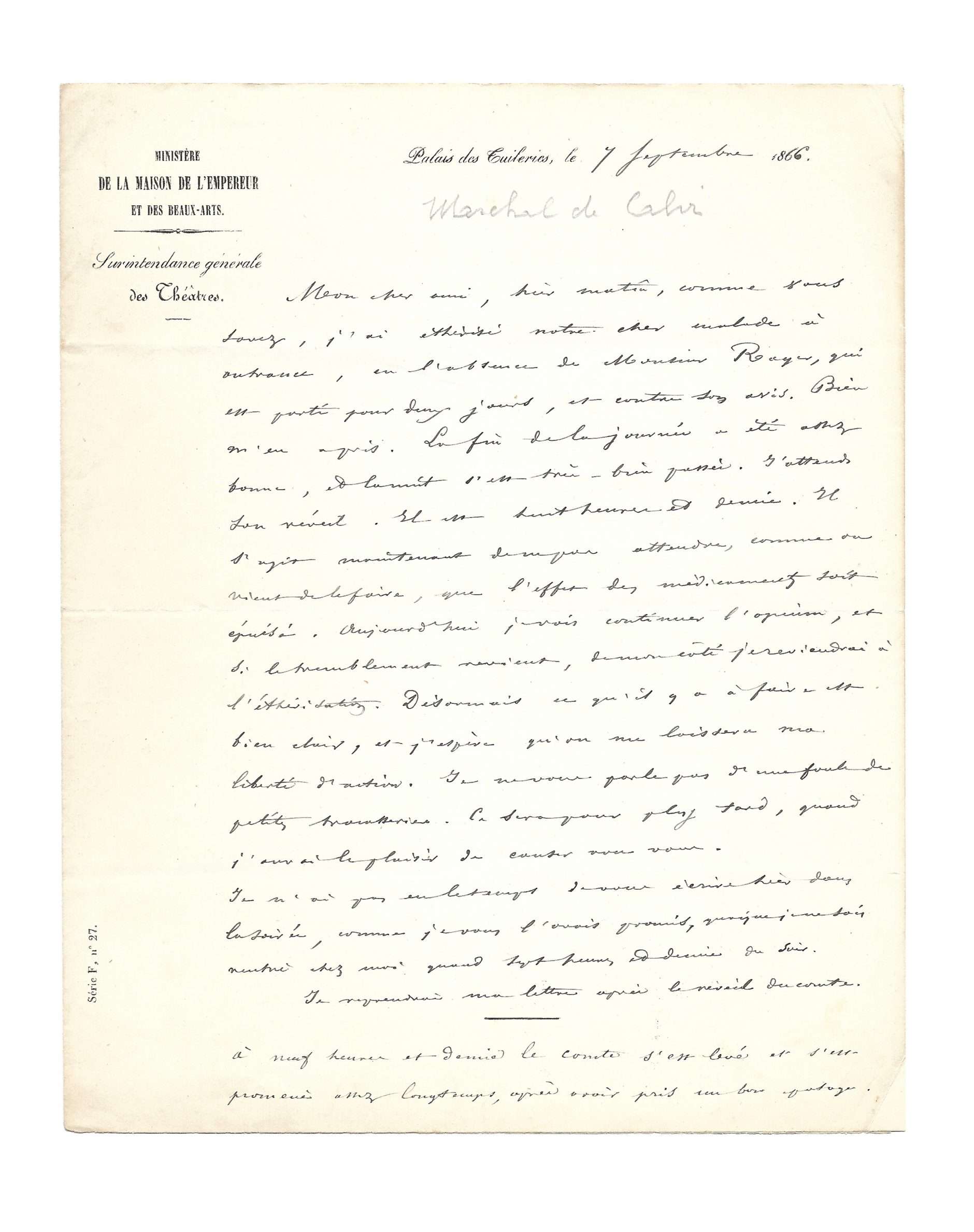 palais des Tuileries, 7 septembre 1866, sur papier en-tête du ministère de la maison de l’Empereur et des Beaux-arts, surintendance générale des Théâtres