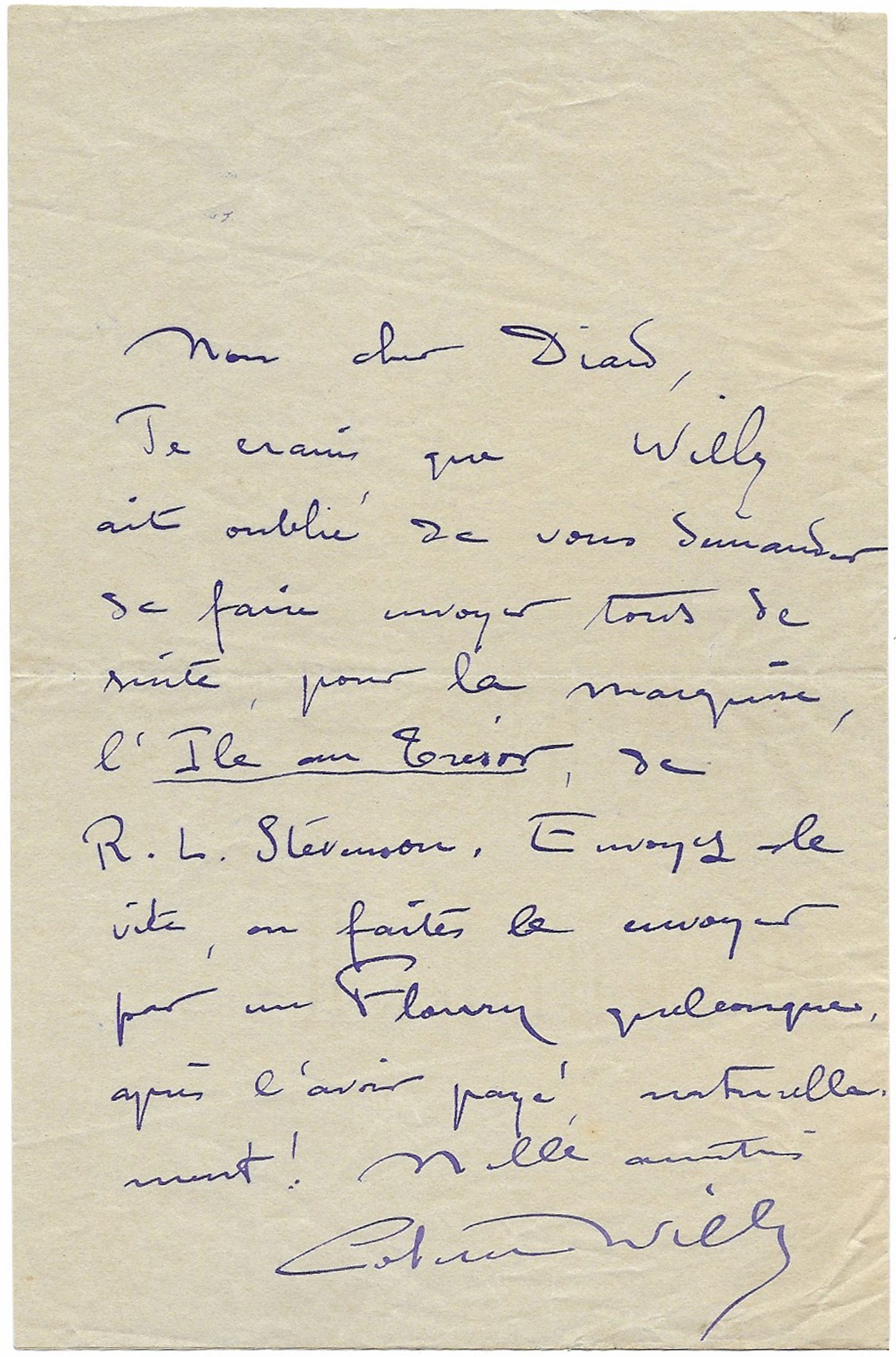 Je crains que Willy ait oublié de vous demander de faire envoyer tout de suite, pour la marquise [Missy], l‘Île au Trésor, de R.L. Sevenson. Envoyez le vite, ou faites le envoyer par un Floury quelconque [allusion au libraire-éditeur Henri Floury], après l’avoir payé, naturellement !