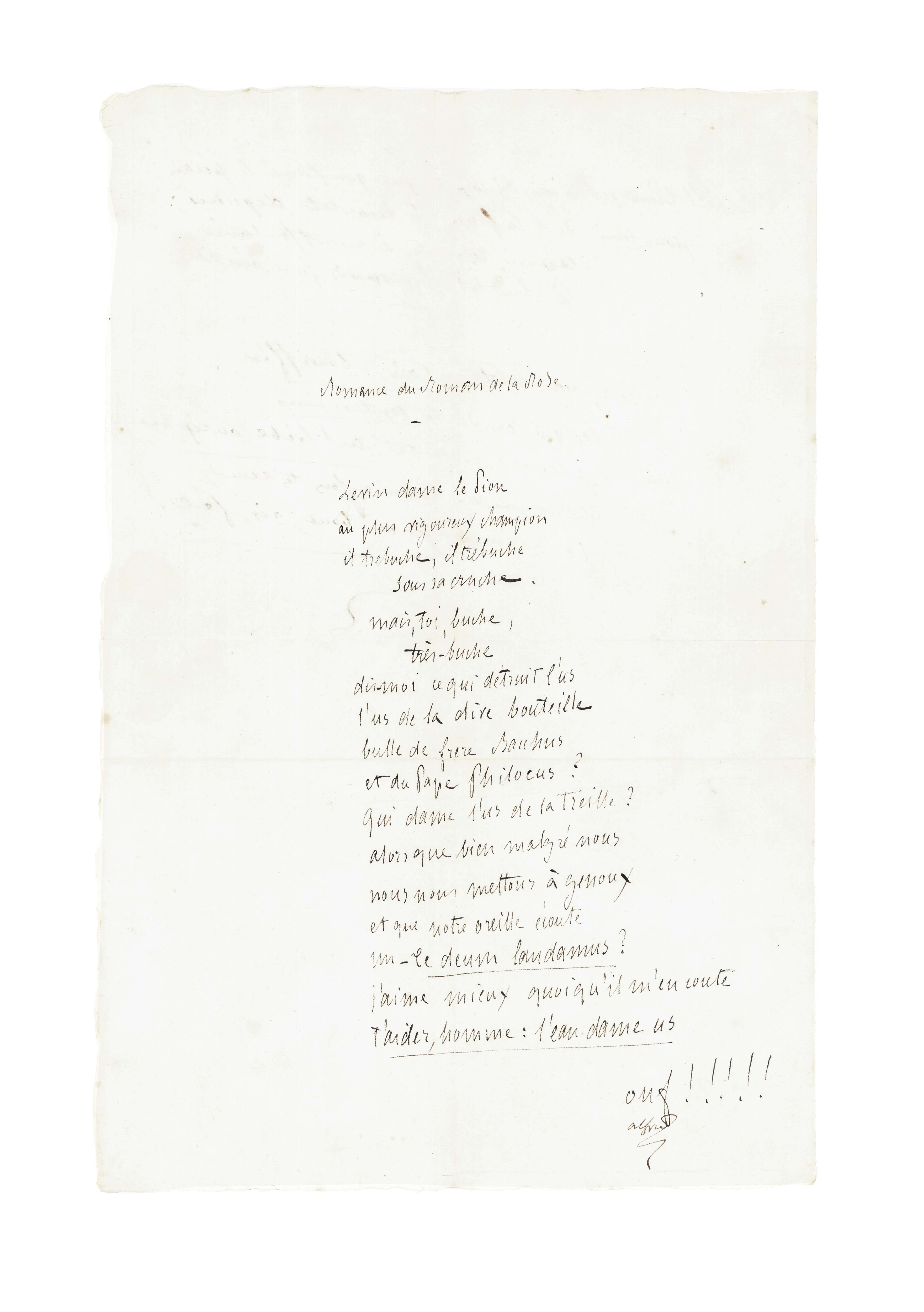 Badinage poétique, conclu d’un plaisant « ouf », probablement écrit dans un moment de sociabilité intime, comme le suggèrent les mentions de l’époque d’une autre main portées au verso, soit un quatrain et un quintil écrits sur le même modèle cocasse à base de calembour.