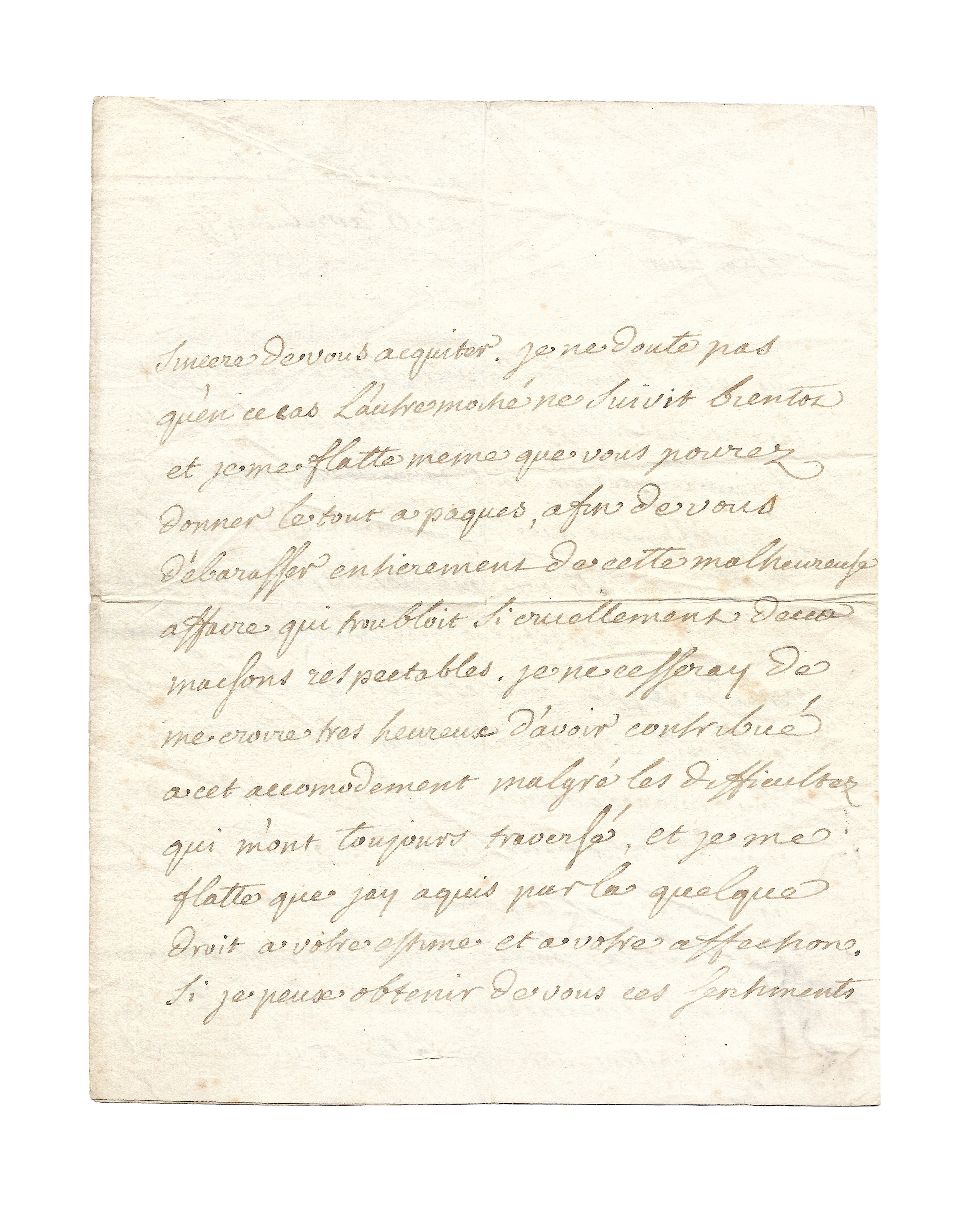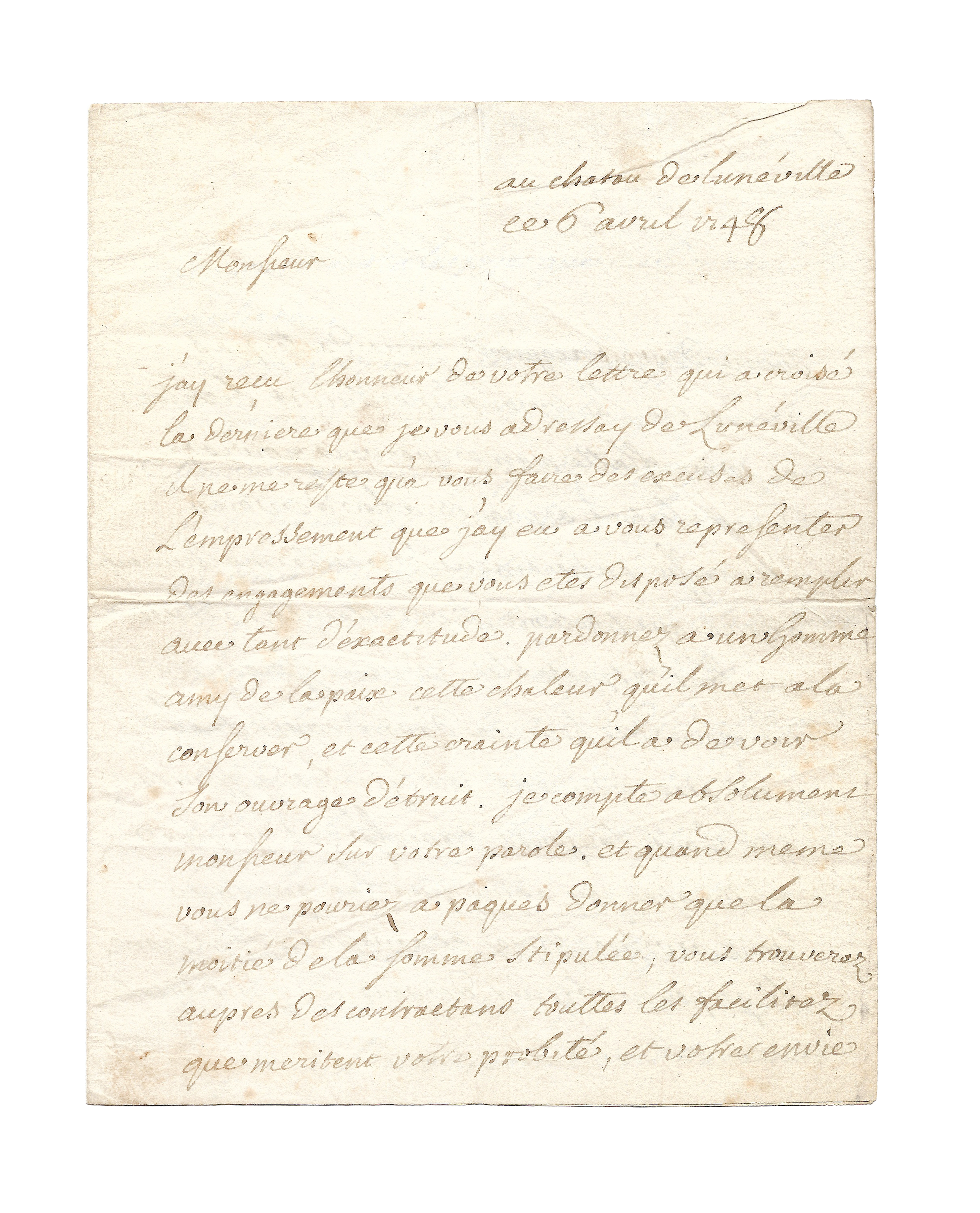 « J’ay reçu l’honneur de votre lettre qui a croisé la dernière que je vous adressay de Lunéville. Il ne me reste que vous faire des excuses de l’empressement que j’ay eu à vous représenter des engagements que vous êtes disposé à remplir avec tant d’exactitude. Pardonnez à un homme amy de la paix cette chaleur qu’il met à la conserver, et cette crainte qu’il a de voir son ouvrage détruit. Je compte absolument monsieur sur votre parole, et quand même vous ne pouriez à Pâques donner que la moitié de la somme stipulée, vous trouverez auprès des contractans touttes les facilitez que méritent votre probité et votre envie sincère de vous acquiter. Je ne doute pas qu’en ce cas l’autre moitié ne suivît bientôt et je me flatte même que vous pourrez donner le tout à Pâques, afin de vous débarasser entièrement de cette malheureuse affaire qi troubloit si cruellement deux maisons respectables. Je ne cesseray de me croire très heureux d’avoir contribué à cet accomodement malgré les difficultez qui m’ont toujours traversé, et je me flatte que j’ay acquis par là quelque droit à votre estime et à votre affection. Si je peux obtenir de vous ces sentiments, ils ajouteront à la joye que me donne votre conciliation. Vous pouvez monsieur d’adresser, tous les papiers, billets de change, ou les pouvoirs que vous jugerez à propos. Je n’abuseray pas de votre confiance, je mettray tout en règle, je vous enverray les quittances et décharges valables. Tout sera fait dans le meilleur ordre.