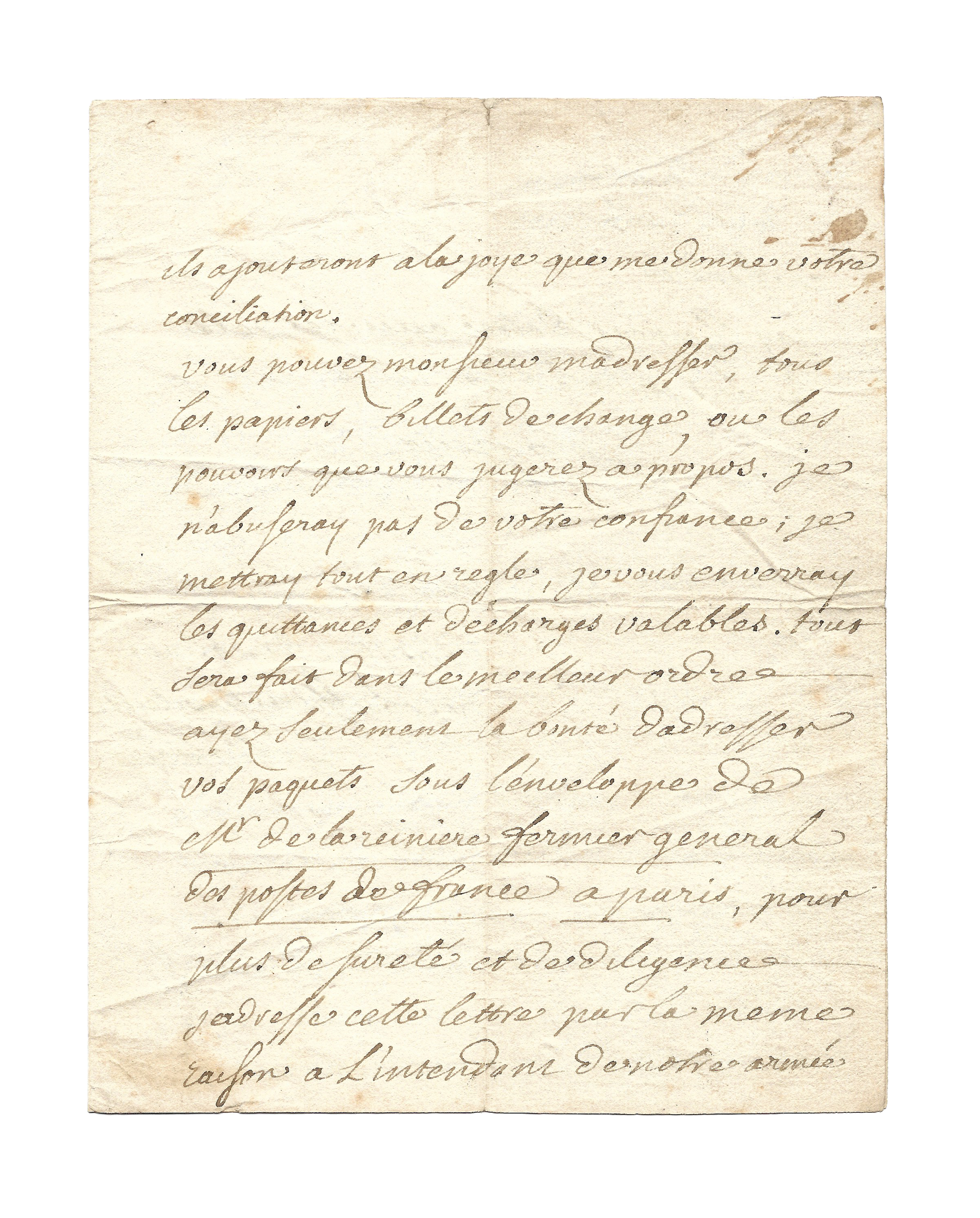 Ayez seulement la bonté d’adresser vos paquets sous l’enveloppe de Mr de la Reinière fermier général des Postes de France à Paris. Pour plus de sûreté et de diligence, j’adresse cette lettre par la même raison à l’intendant de votre armée en Flandres.