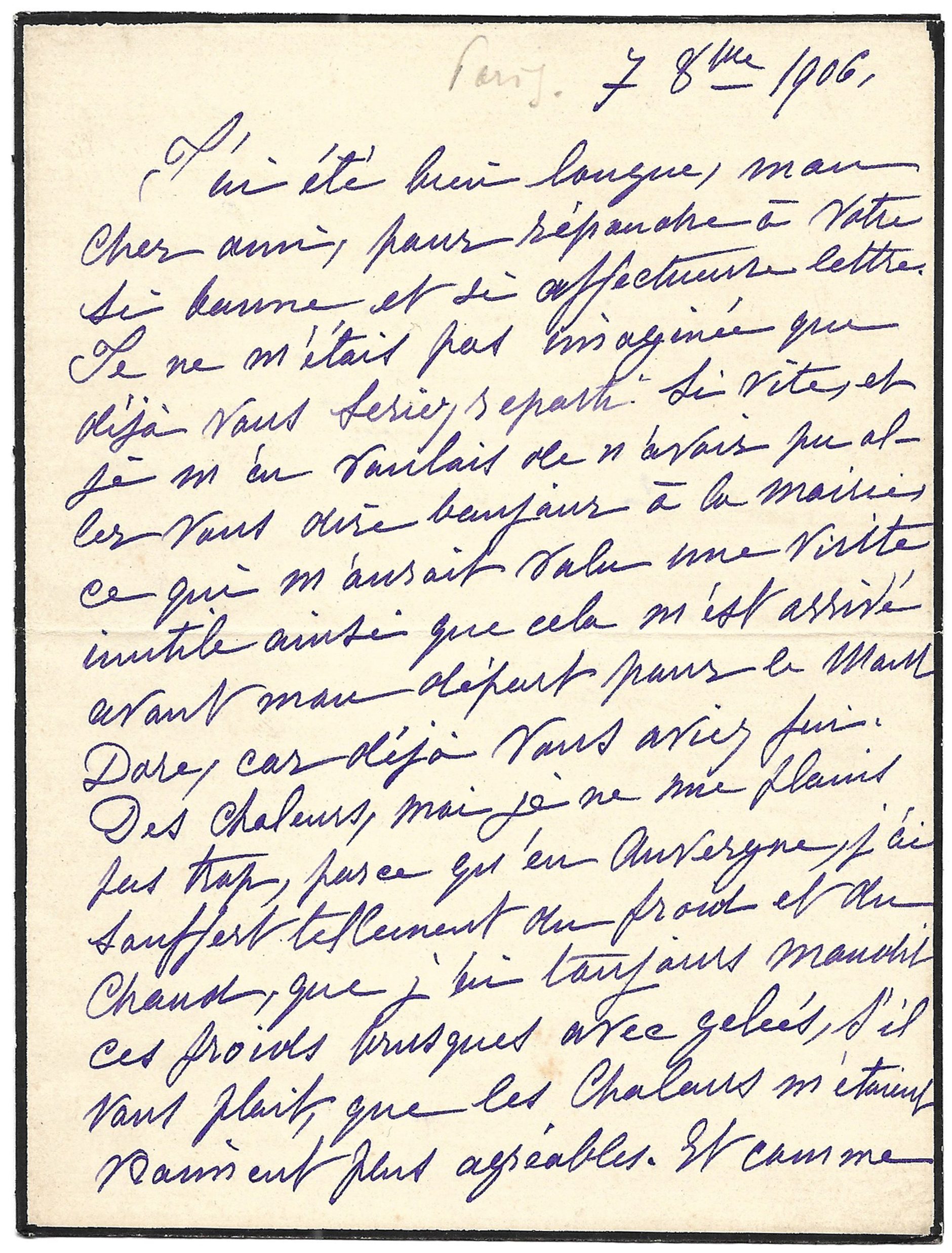 [Paris], 7 8bre [octobre] 1906, 8 pp. in-8° à l’encre violette sur papier de deuil