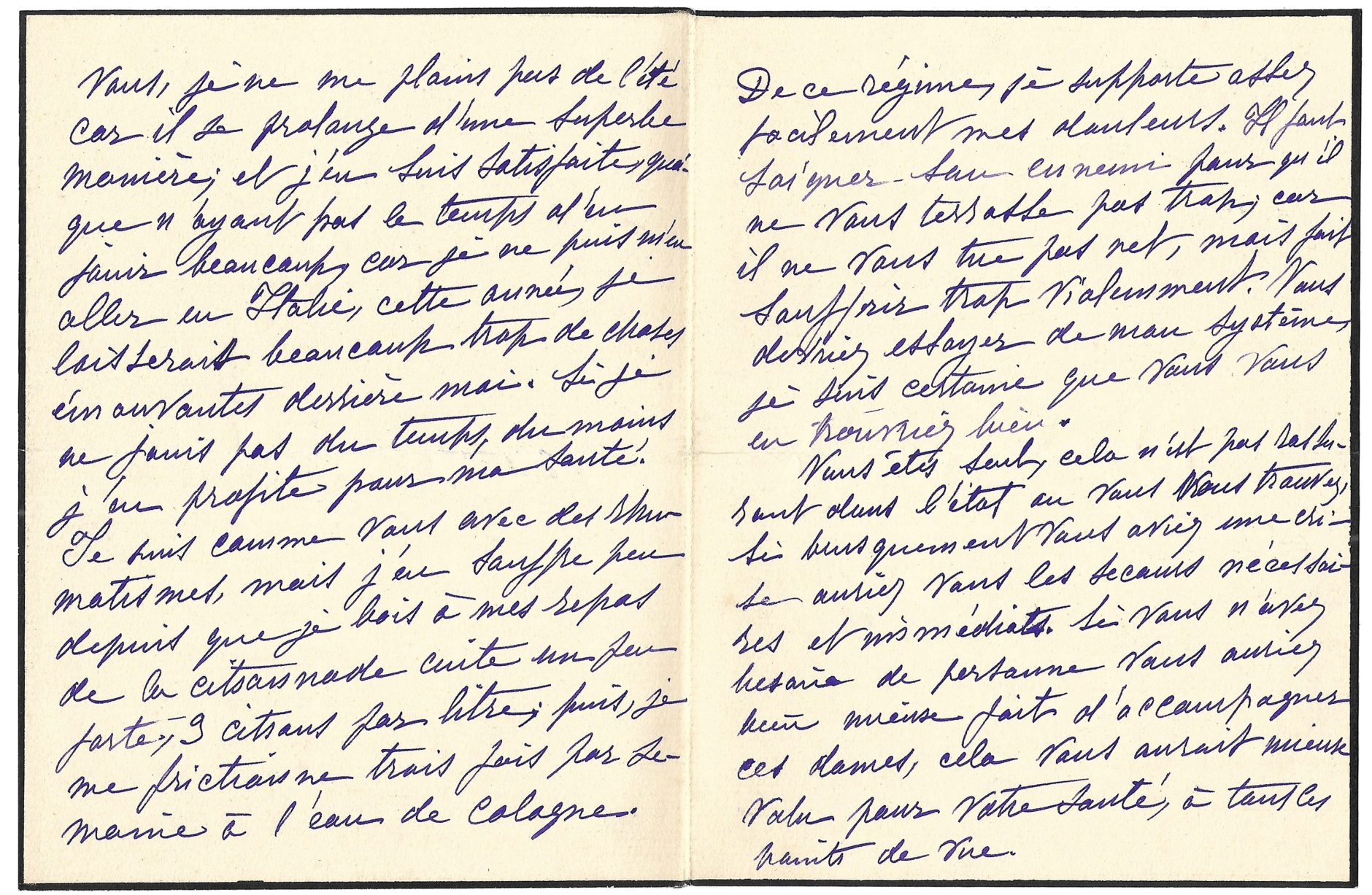Et comme vous, je ne me plains pas de l’été car il se prolonge d’une superbe manière ; et j’en suis satisfaite, quoi que n’ayant pas eu le temps d’en jouir beaucoup, car je ne puis m’en aller en Italie, cette année, je laisserai beaucoup trop de choses émouvantes derrière moi. […].