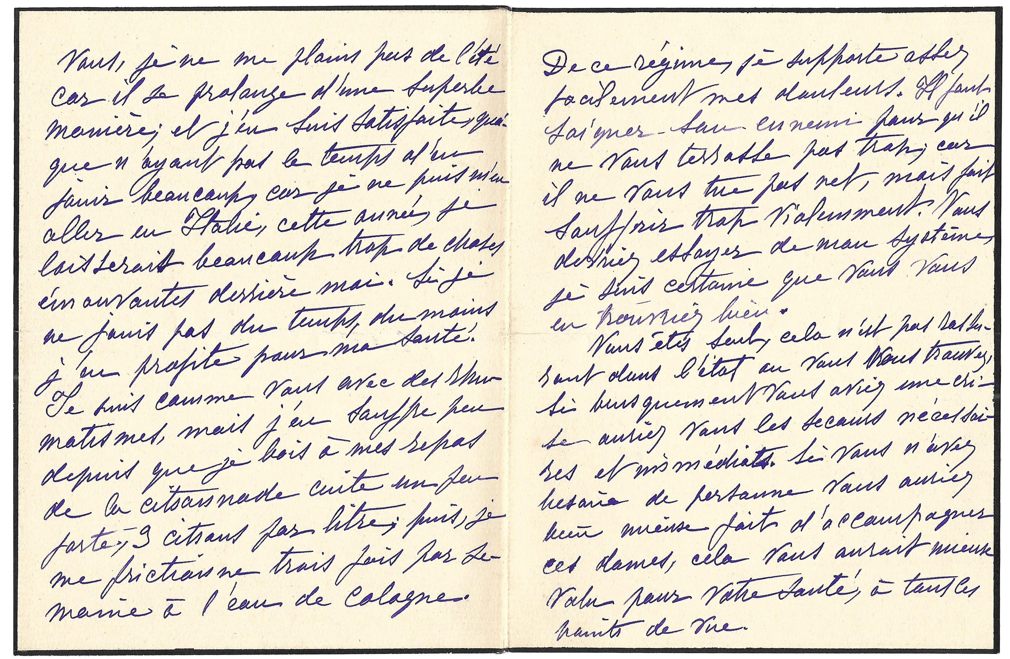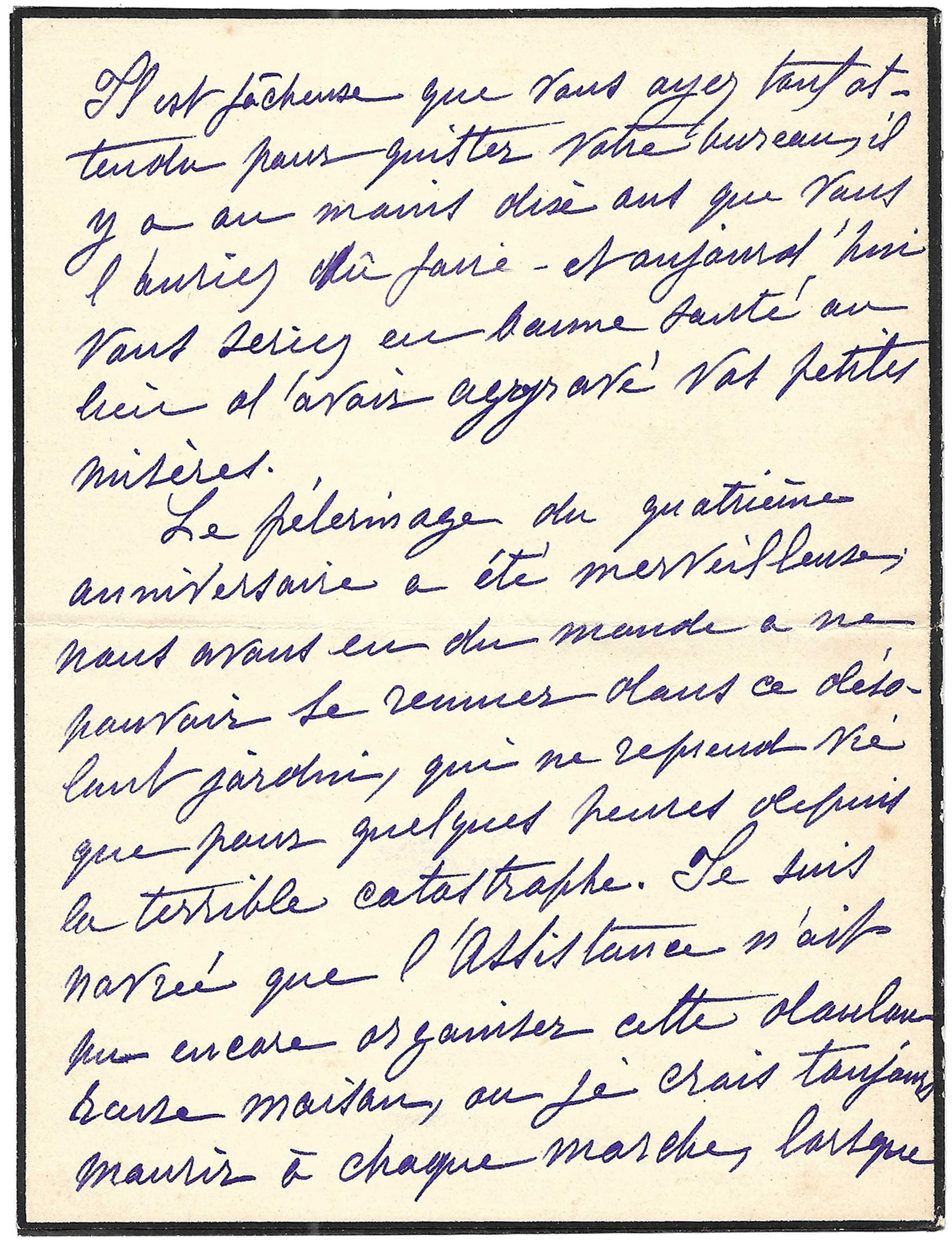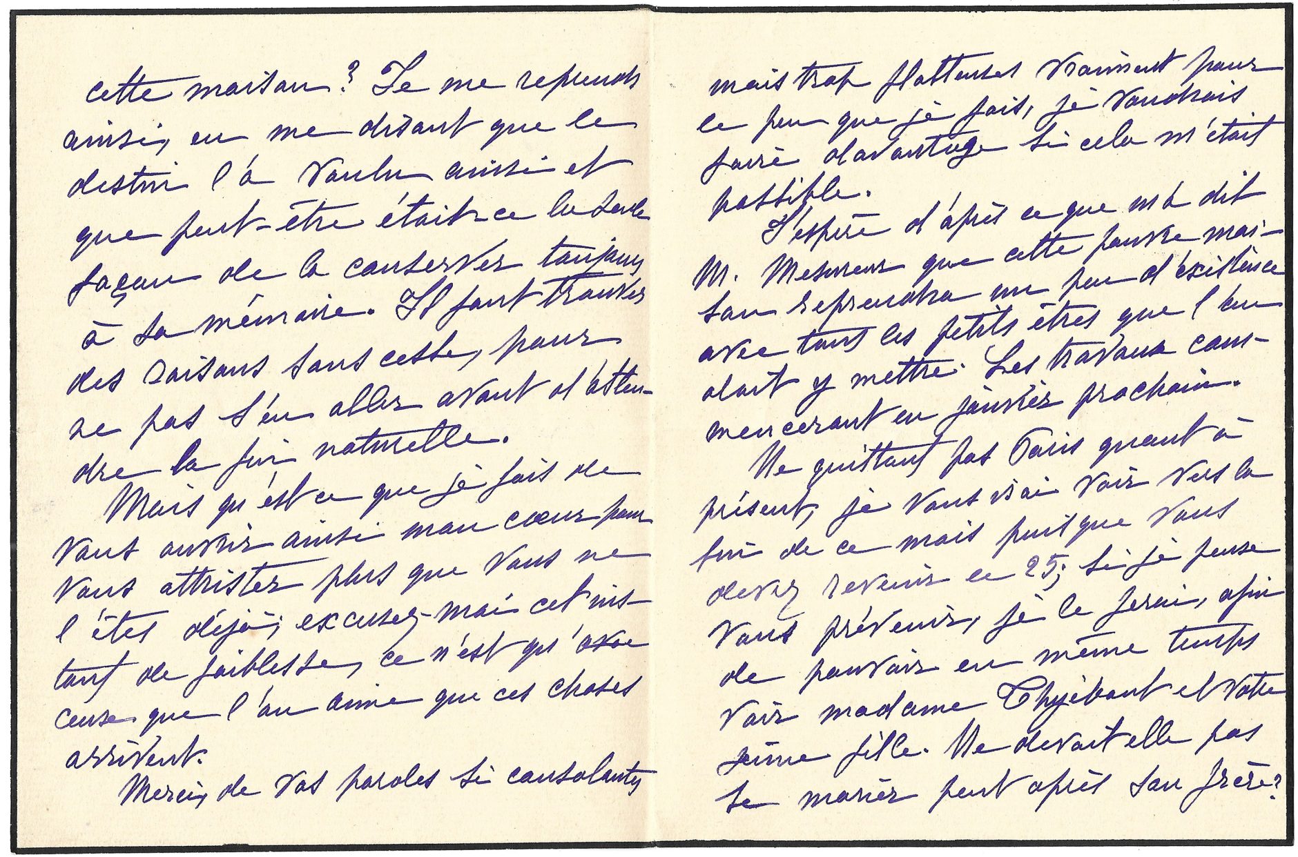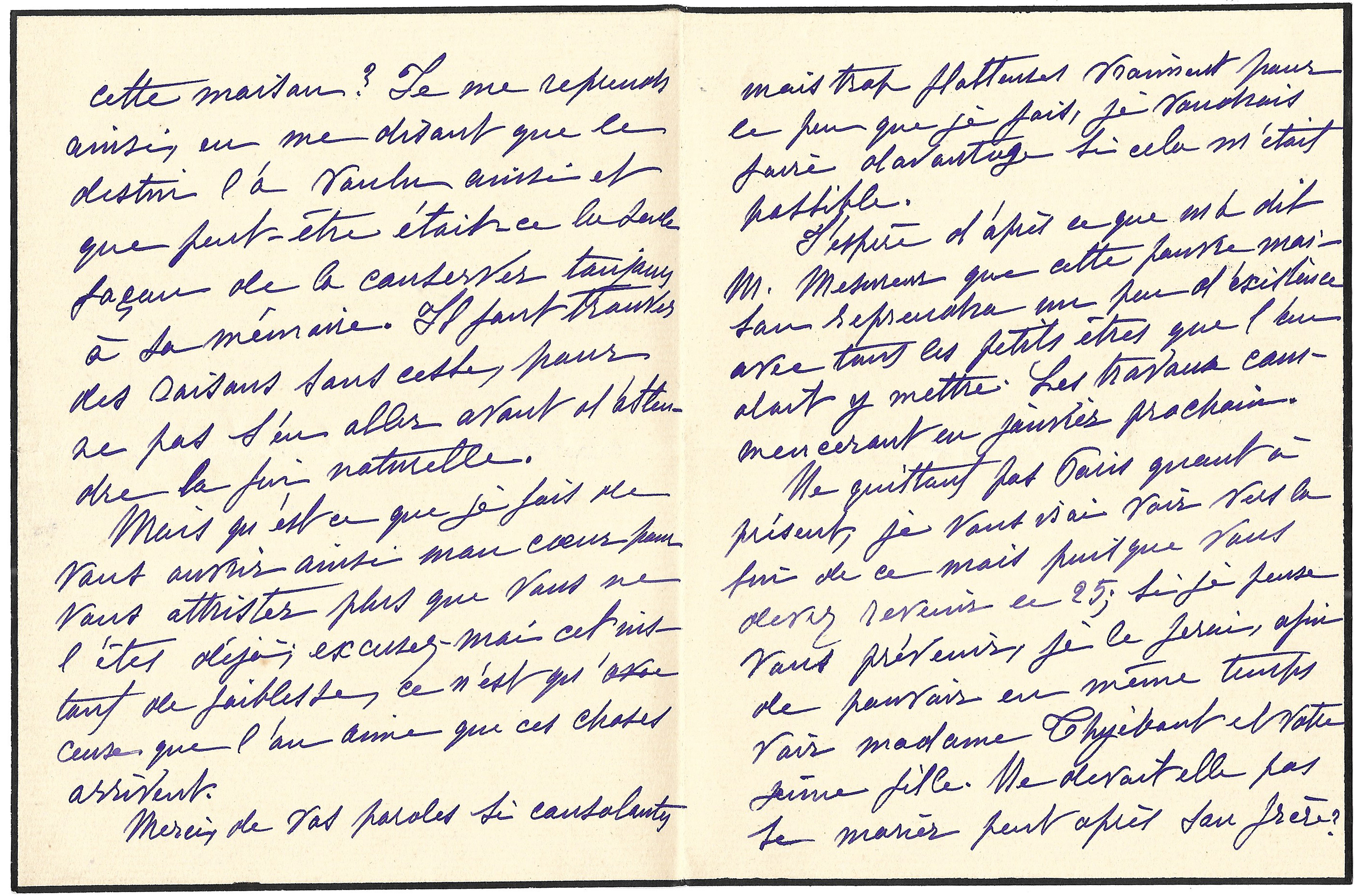 « J’ai été bien longue, mon cher ami, pour répondre à votre si bonne et si affectueuse lettre. Je ne m’étais pas imaginée que déjà vous seriez reparti si vite, et je m’en voulais de n’avoir pu aller vous dire bonjour à la mairie […].