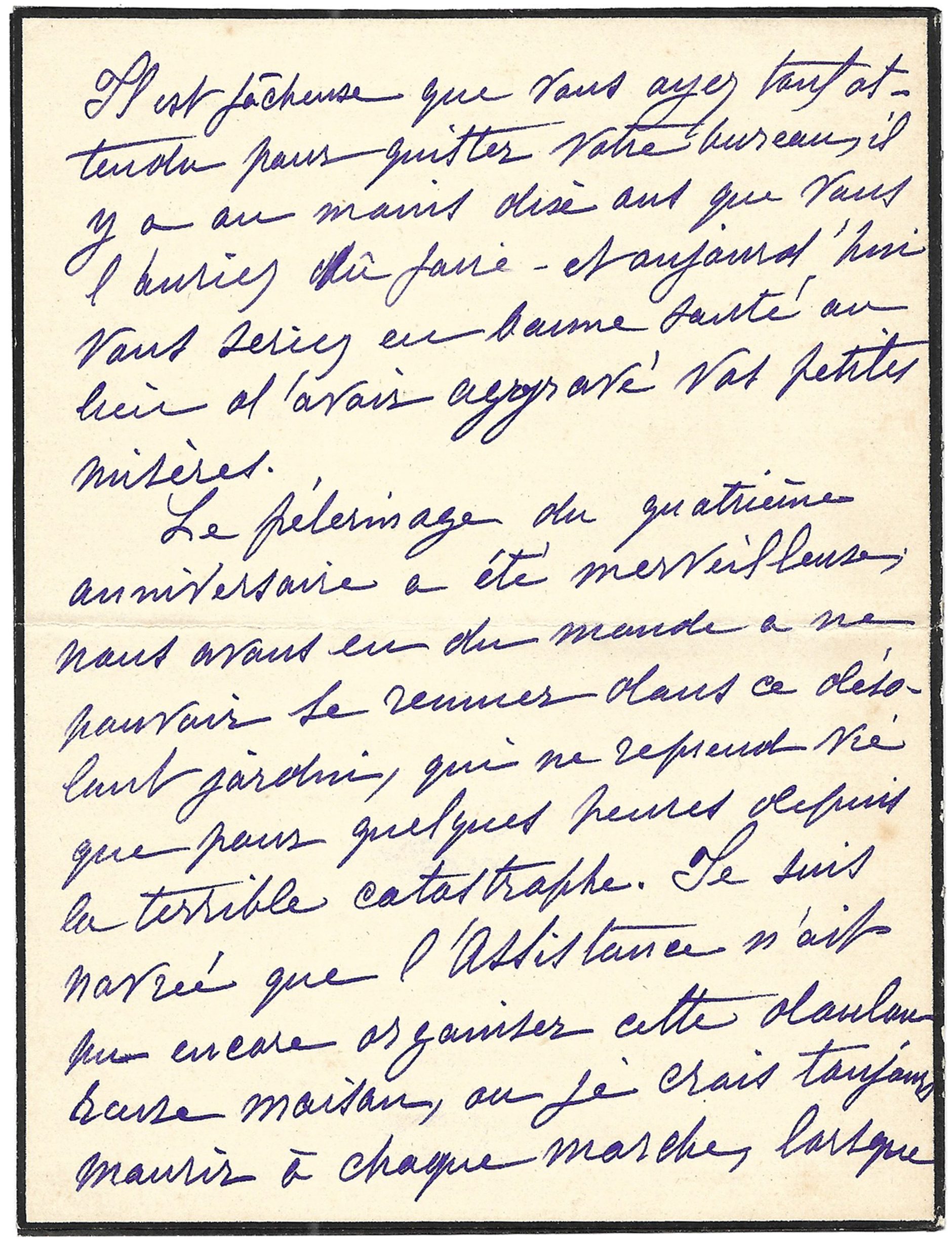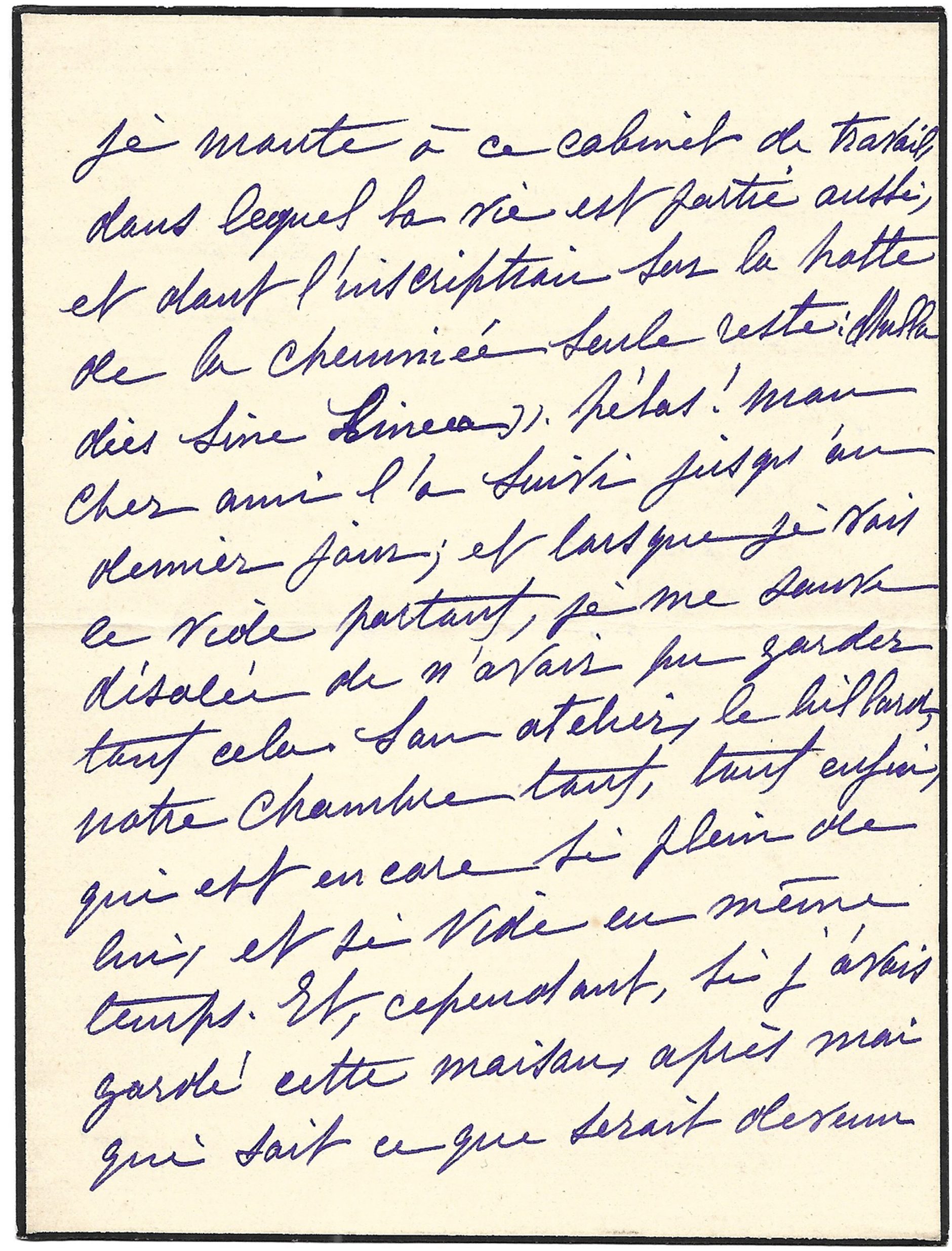 Le pèlerinage du quatrième anniversaire a été merveilleux, nous avons eu du monde à ne pouvoir se remuer dans ce désolant jardin, qui ne reprend vie que pour quelques heures depuis la terrible catastrophe. Je suis navrée que l’assistance n’ait pas su encore organiser cette douloureuse maison, où je crois toujours mourir à chaque marche, lorsque je monte à ce cabinet de travail dans lequel la vie est partie aussi, et dont l’inscription sur la hotte de la cheminée reste : « Nulla dies sine linea ». Hélas ! mon cher ami l’a suivi jusqu’au dernier jour ; et lorsque je vois le vide partout, je me sauve désolée de n’avoir pu garder tout cela. Son atelier, le billard, notre chambre tout, tout enfin, qui est encore si plein de lui, et si vide en même temps. Et, cependant, si j’avais gardé cette maison, après moi qui sait ce que serait devenue cette maison ? Je me reprends ainsi, en me disant que le destin l’a voulu ainsi et que peut-être était-ce la seule façon de la conserver toujours à sa mémoire. Il faut trouver des raisons sans cesse, pour ne pas s’en aller avant d’attendre la fin naturelle.