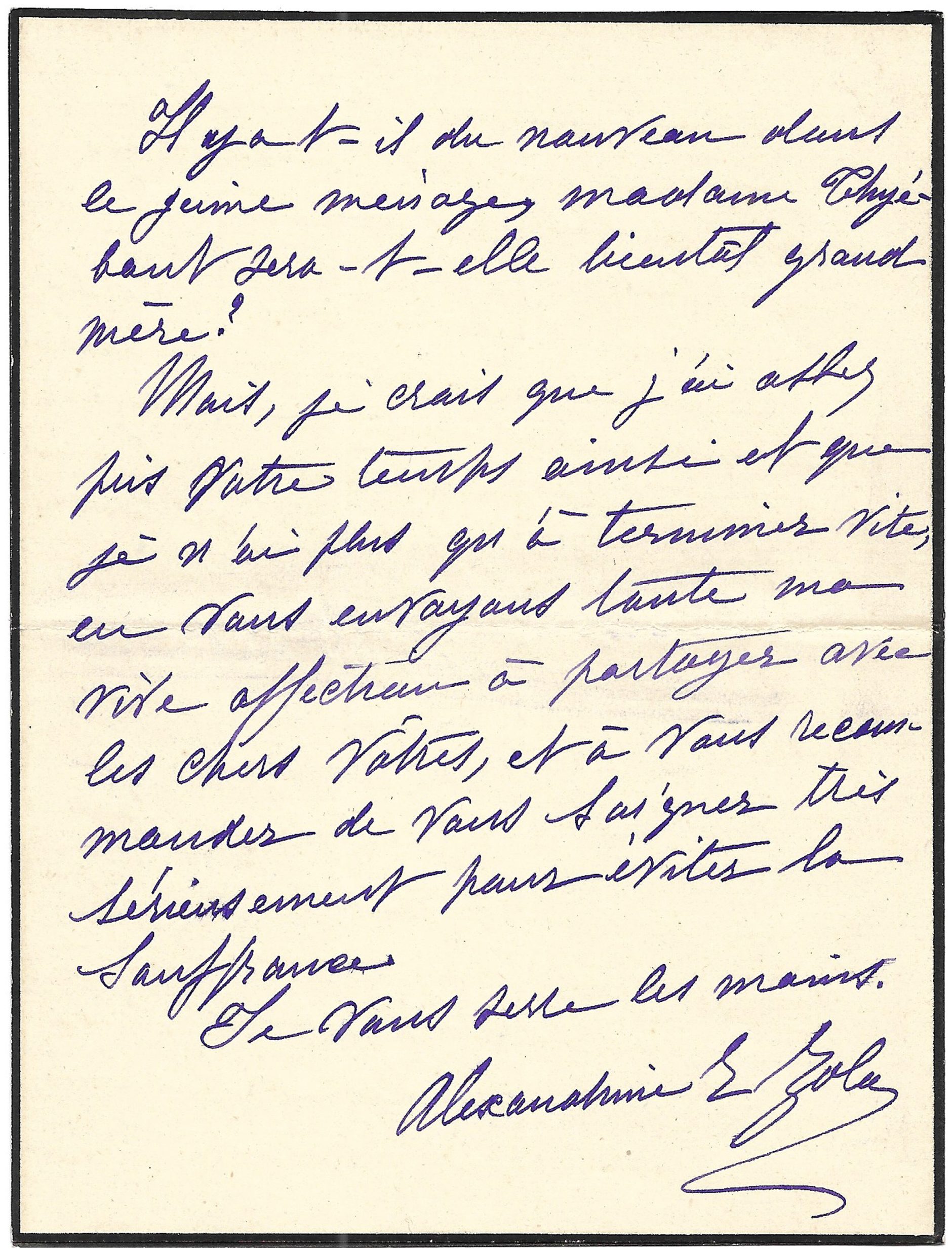 Lettre autographe signée « Alexandrine Zola » à Gabriel Thyébaut