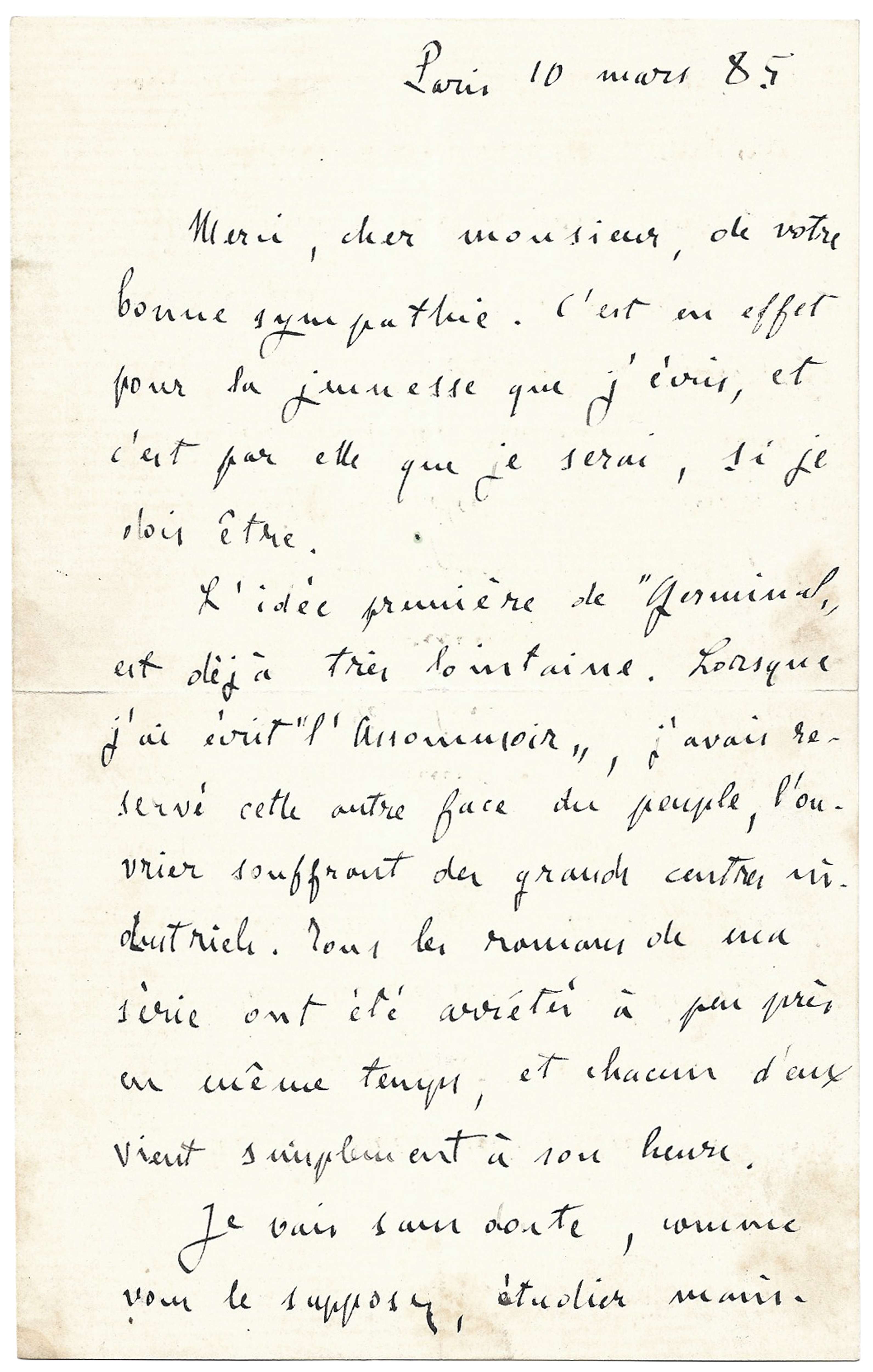 On connaît la lettre que Joseph Canqueteau, sur le point de faire une conférence sur Les Rougon-Macquart, adresse à Zola pour lui demander quelques renseignements (tout en ayant vu juste) : « Nous sommes là une réunion de jeunes, qui vous aimons bien, je vous l’assure, et savoir vous défendre à l’occasion. Vous avez la jeunesse pour vous, cher maître, c’est là un rude appoint. Nous apprécions vivement l’honneur que vous nous avez fait en acceptant le titre de membre d’honneur de notre jeune conférence. Quel puissant livre que Germinal ! […] Je vous serais obligé, cher maître, de me dire à quelle époque au juste vous avez eu l’idée de cette vaste étude sociale ? La vie militaire et la vie artistique ne feront-elles pas l’objet de deux prochaines œuvres ? ».