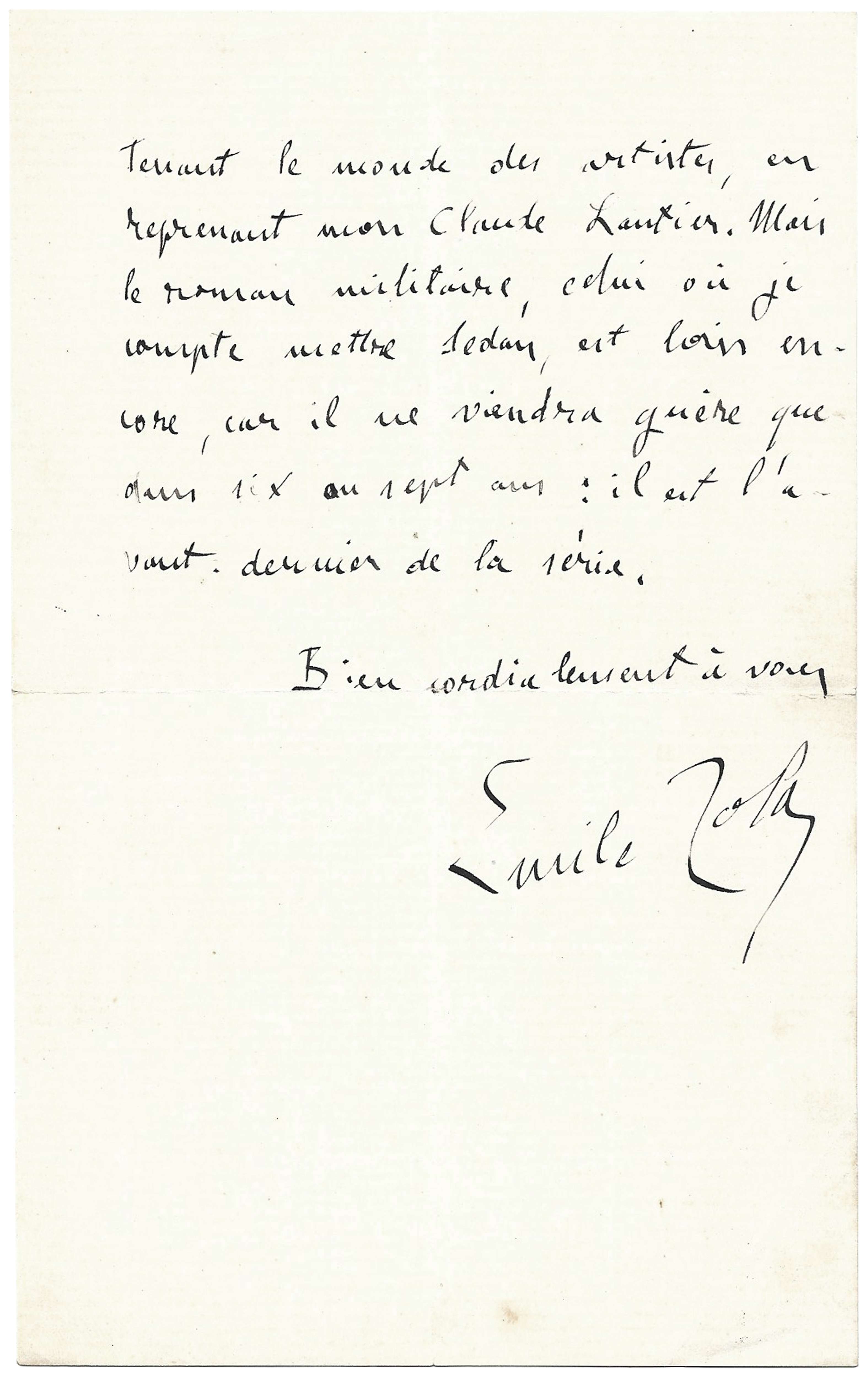 Je vais sans doute, comme vous le supposez, étudier maintenant le monde des artistes, en reprenant mon Claude Lantier [L’Œuvre]. Mais le roman militaire, celui où je compte mettre Sedan [La Débâcle], est loin encore, car il ne viendra guère que dans six ou sept ans : il est l’avant dernier de la série.