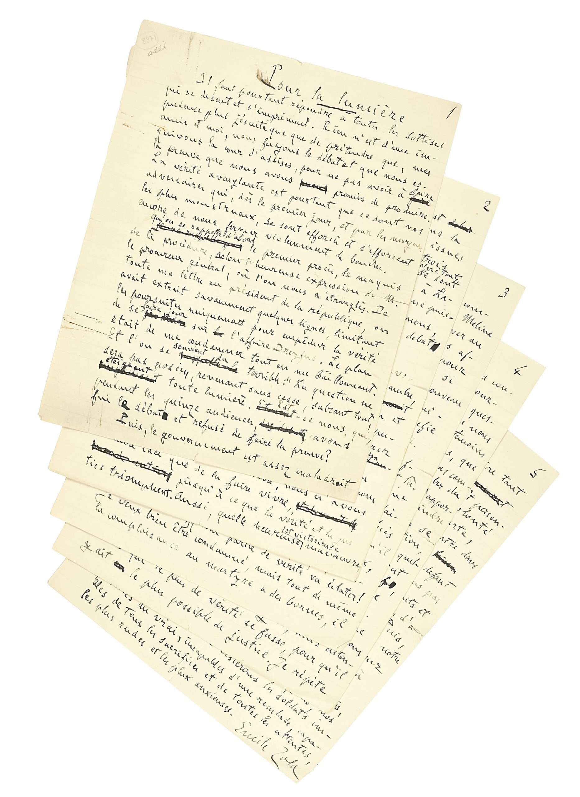 Ce manuscrit est un article inédit d’Émile Zola rédigé en juillet 1898, six mois après sa lettre ouverte « J’accuse… ! » s’inscrivant directement dans sa continuité. Il s’agit du seul article sur l’Affaire que Zola a écrit pendant son exil. Destiné à figurer en première page de L’Aurore, il n’a jamais été publié, car très probablement censuré par Georges Clemenceau, rédacteur au journal. Ce dernier s’est en effet servi du présent manuscrit pour publier « Pour la Preuve » en une de L’Aurore du 20 juillet 1898. À la lecture des deux textes, « Pour la Preuve » apparaît nettement plus édulcoré que « Pour la Lumière », et largement expurgée par endroits. Toute la puissance du verbe « Zolien » disparaît ainsi sous les traits d’un article fade et sans saveur.