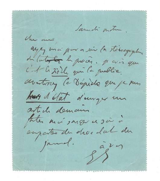 Autograph letter signed “G.C” to his secretary Étienne Winter at the L’Aurore newspaper