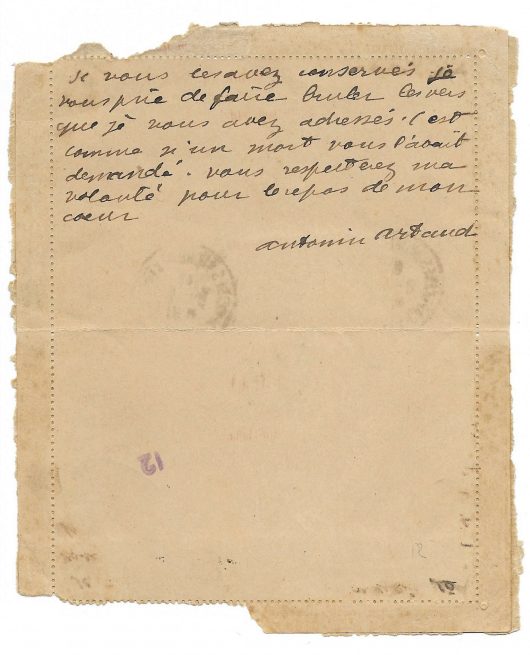 Autograph letter signed “Antonin Artaud” to his sister Marie-Ange Malausséna