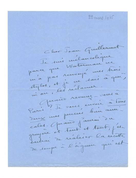 [Paris], 24 [December 1950], 2 p. in-8° on blue paper