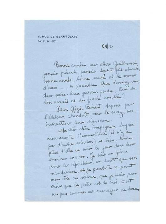 Autograph letter signed « votre Colette » to the Guillermet couple