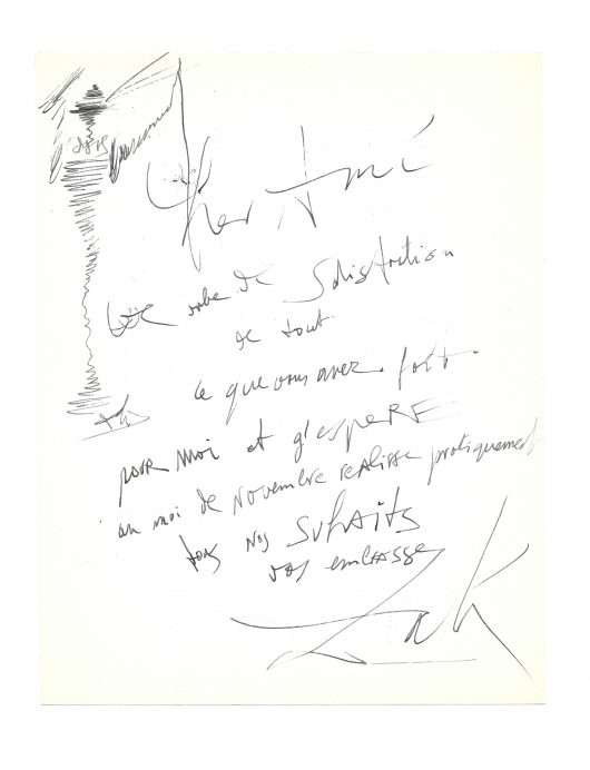 Nice print depicting Dalí in conversation, doubly autographed by him and enriched with an original drawing