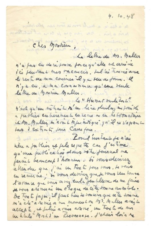 Autograph letter signed « Jean Giono » to the chief editor of Carrefour journal