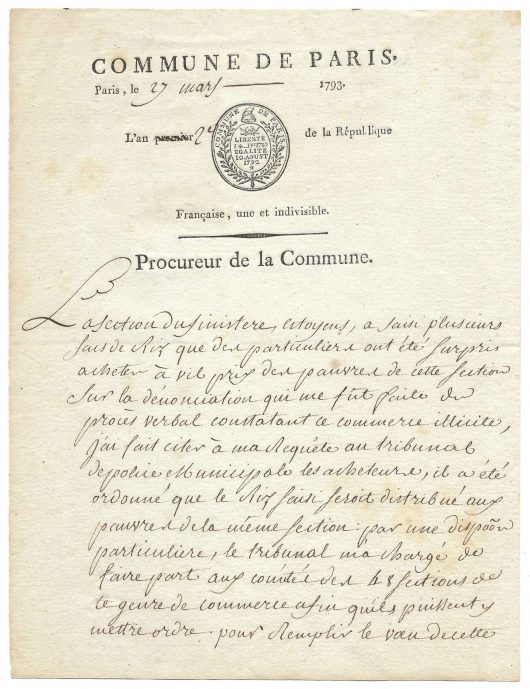 Paris, 27th March 1793, 1 page 1/4 in-4, Commune de Paris letterhead