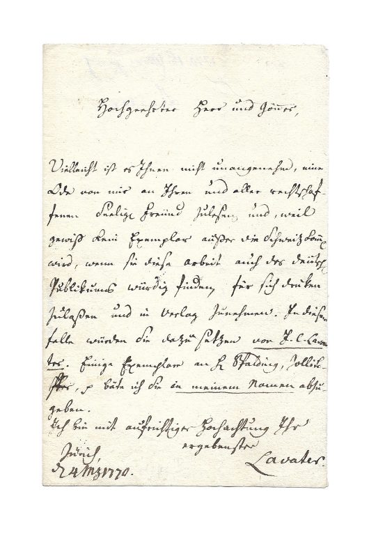 Zurich, 4 March 1770, 1 p. in-12° on laid paper