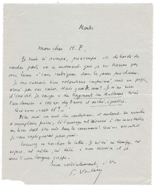 Autograph letter signed « Paul Valéry » to Hermann-Paul