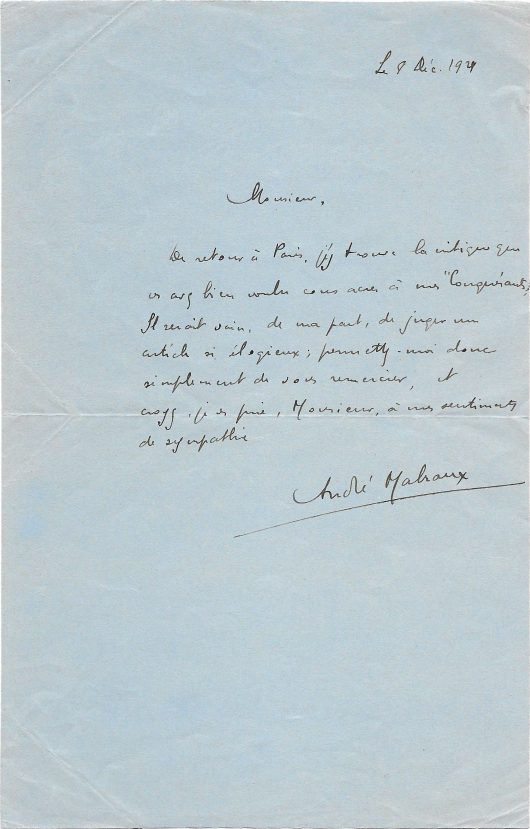 Autograph letter signed « André Malraux » to a critic