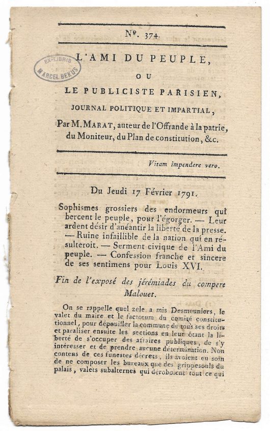 MARAT, Jean-Paul (1743-1793) L’ami du Peuble, original booklet 17th February 1791 “Despise the goodwill of Louis XVI” SOLD