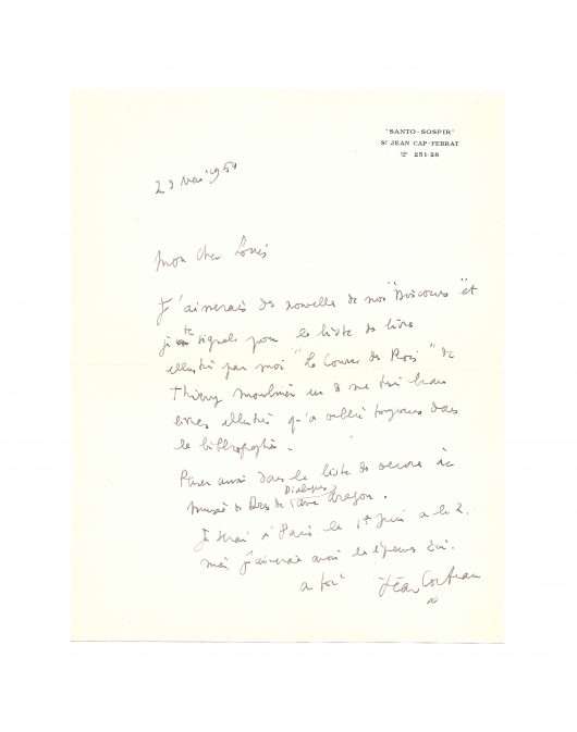 St Jean Cap-Ferrat, 29th May 1954, 1 p. in-4, autograph envelope attached