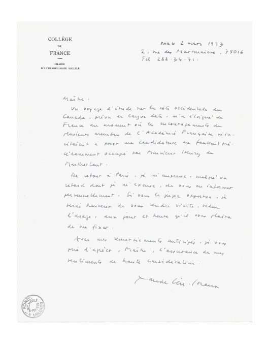 Autograph letter signed « Claude Lévi-Strauss » [to Thierry Maulnier]