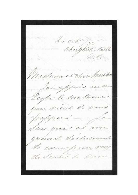 Prince’s gate SW [London], 26 November [1881], 5 p. in-8 on mourning paper